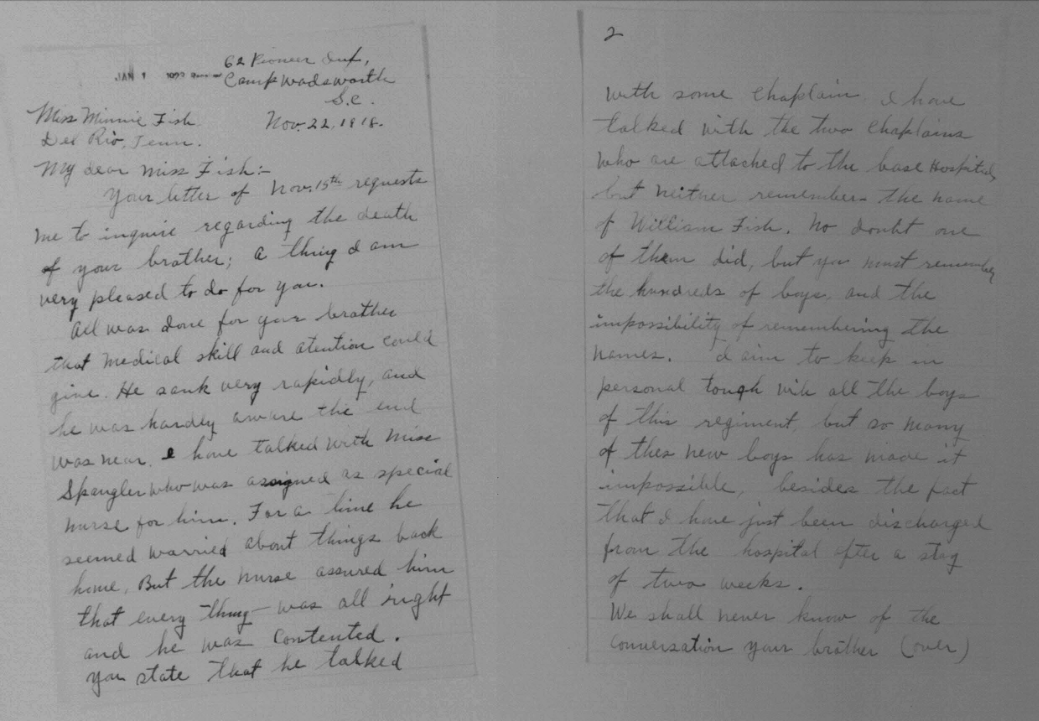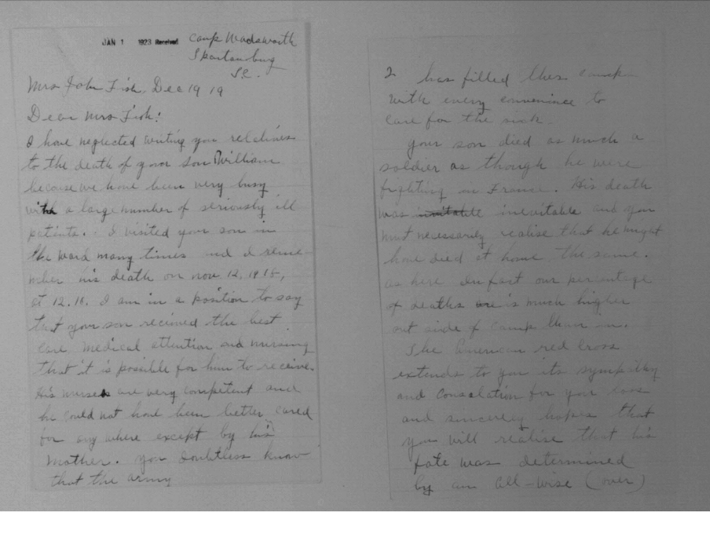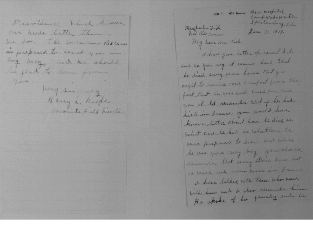 He was inducted into the US Army and served as Private in Company C 62nd Pion Inf. He died 12 November 1918 due to bronchial pneumonia at Camp Wadsworth, Spartanburg, Spartanburg Co. South Carolina.