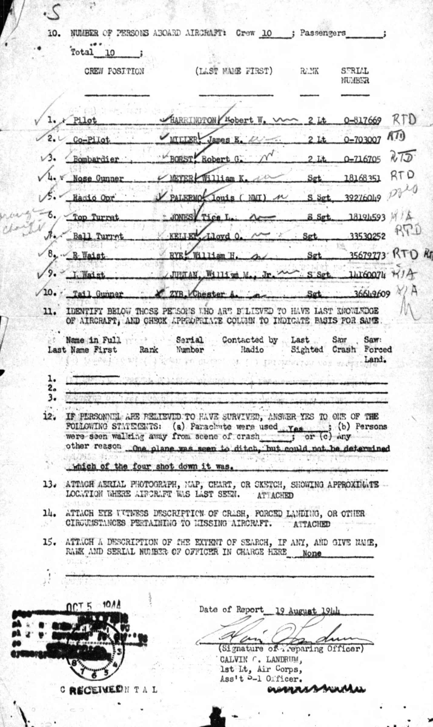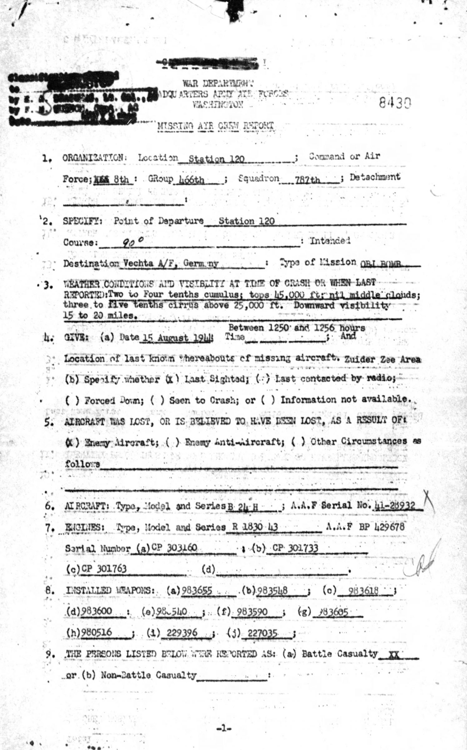 Aircraft B-24H with serial number 41-28932 was on an objective bombing mission to Vechta A/F in Germany. The aircraft was shot down near Gelderingen, 5km West of Steenwijk in the Netherlands. He was initially buried in a small cemetery near Steenwijk by a group of Hollanders.