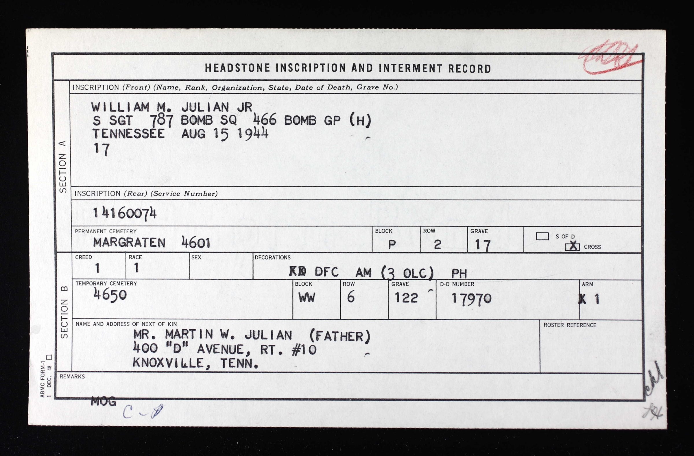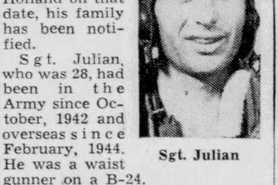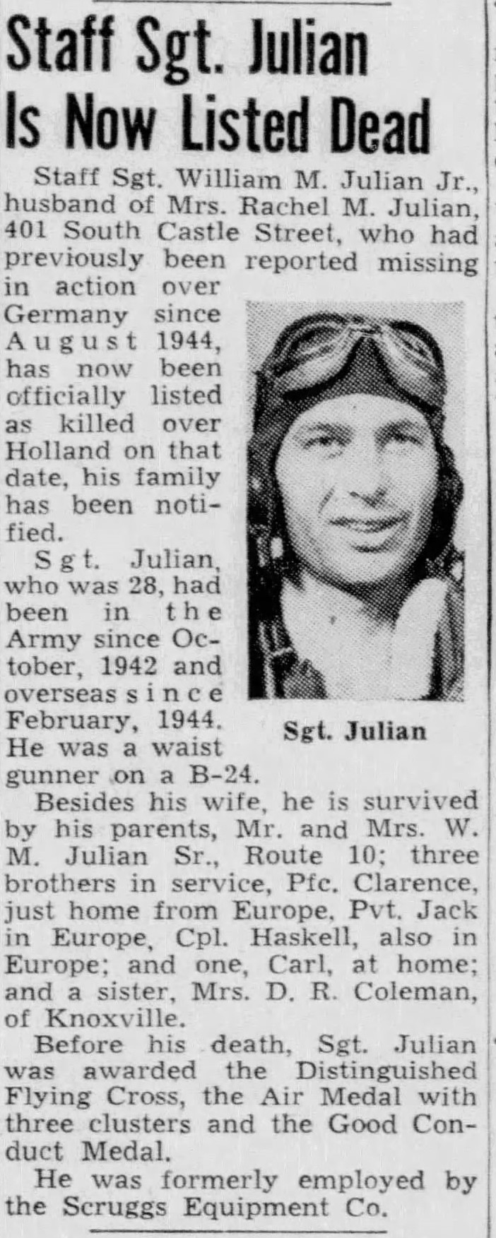 Sgt. William M. Julian Jr., son of Mr. and Mrs. William M. Julian Sr., of Knoxville is a waist gunner-engineer completing at an air base in a Western state. Julian attended Stair Vocational School. His wife is the former Miss Rachel Hauk. She lives at 401 South Castle Street.