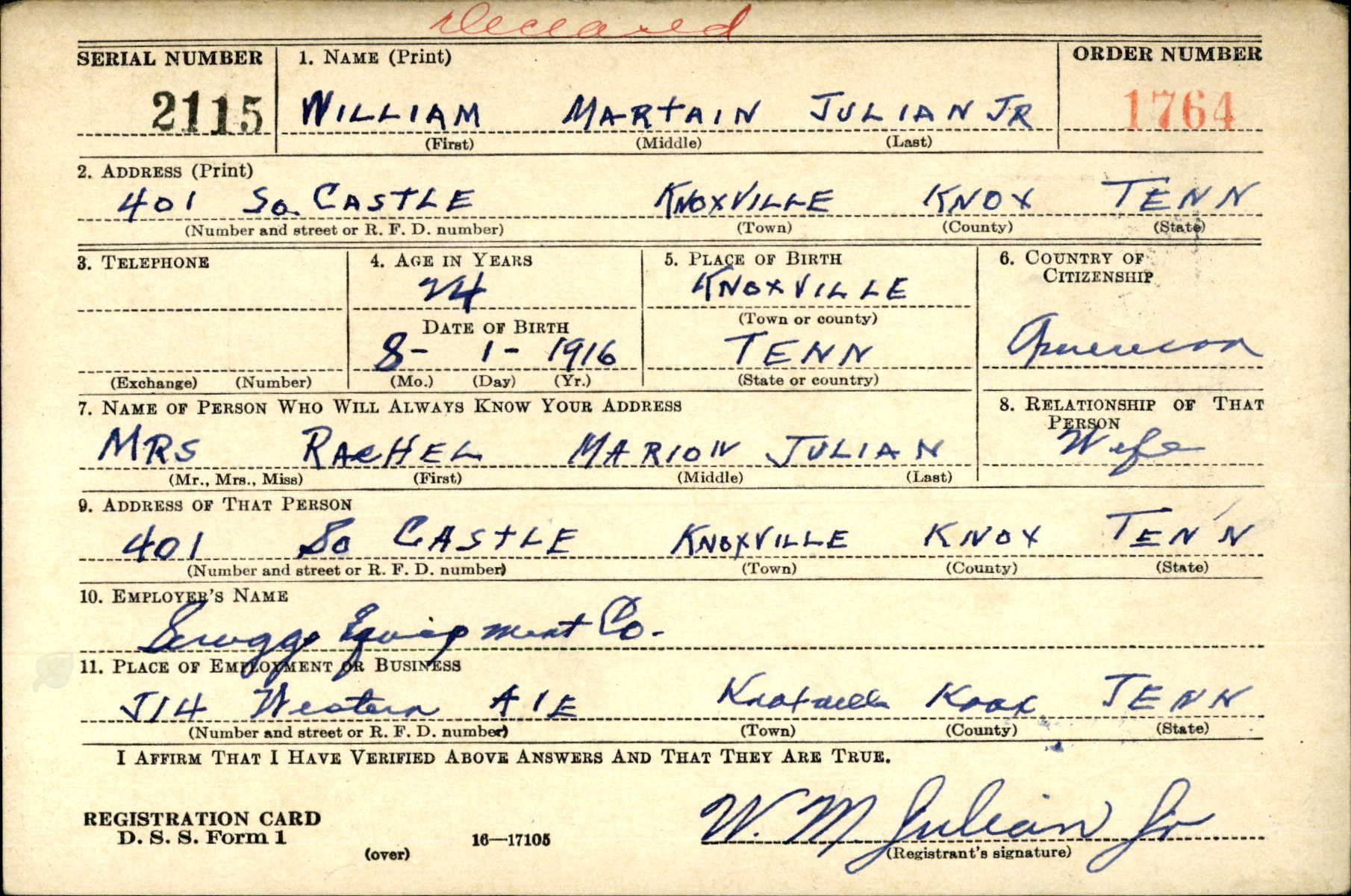William Martain Julian Jr. was the son of William Martain and Christine Julian. He was married to Rachel Marion Houk.