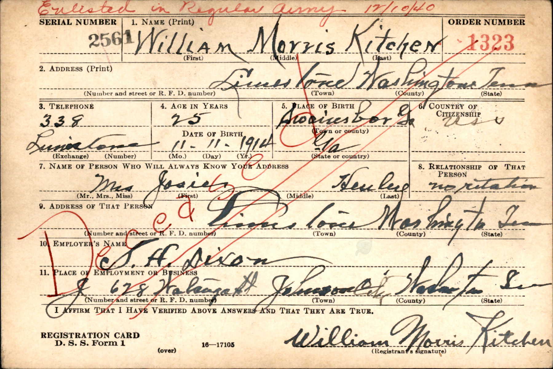 William Morris Kitchen was born on 11 November 1914 in Swainsboro, Georgia. He was a graduate of Science Hill high school. He attended Tusculum college and the University of South Carolina. He married Mary Kelley in 1939. He entered regular service with the Nantional Guard on February 24, 1941 and was discharged from the 191st Field Artillery at Camp Forrest in November 1941 and reenlisted as an aviation cadet at Maxwell Field, Alabama on November 19, 1941. He had worked as a newspaper man on papers in Kingsport, Knoxville, Johnson City and Asheville, N.C.