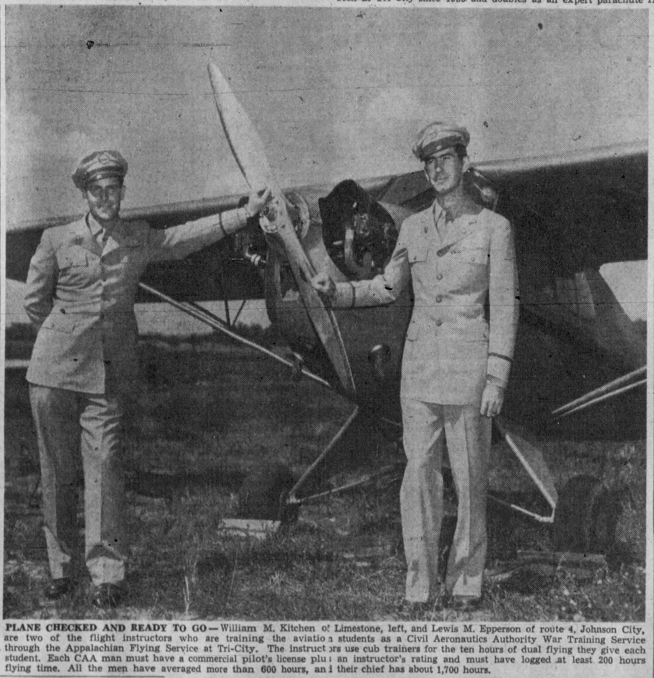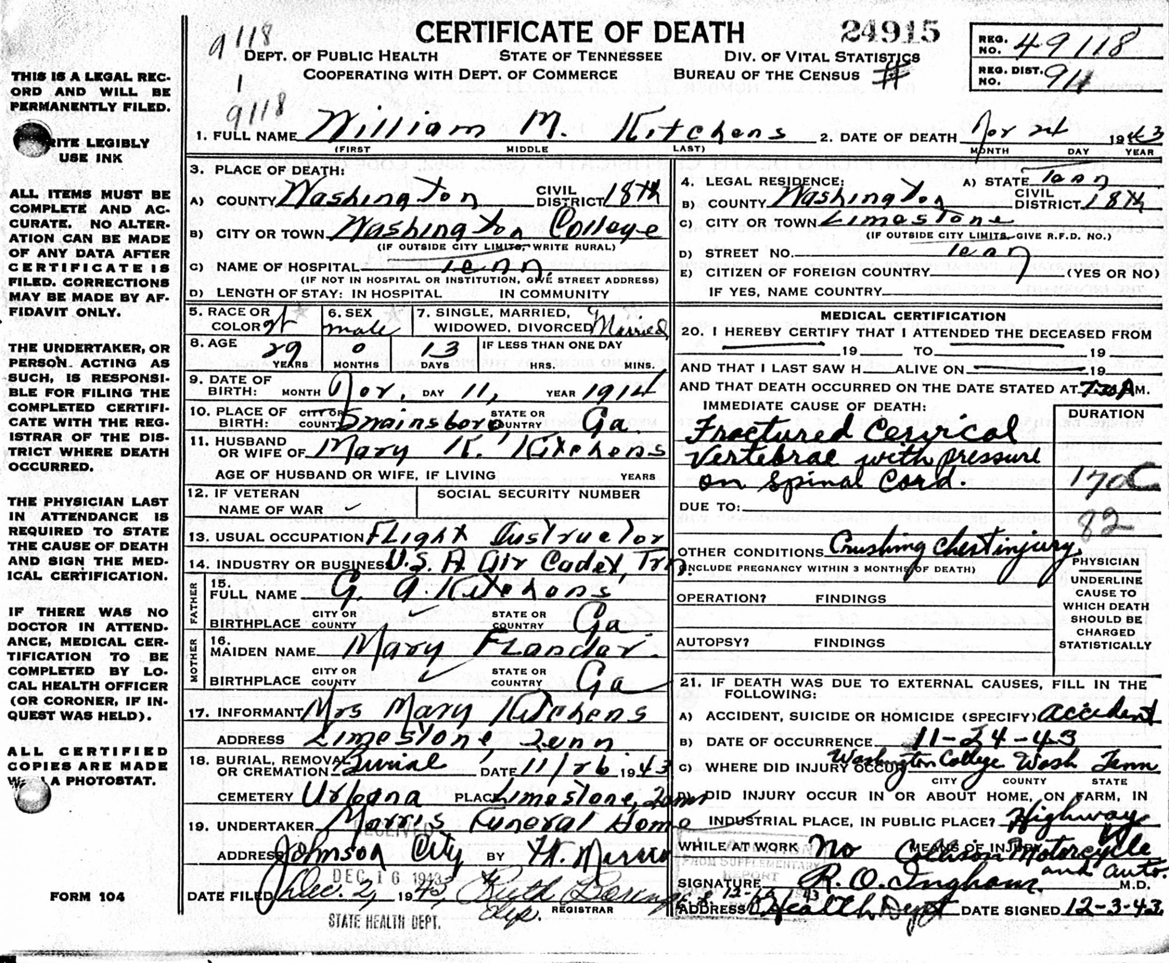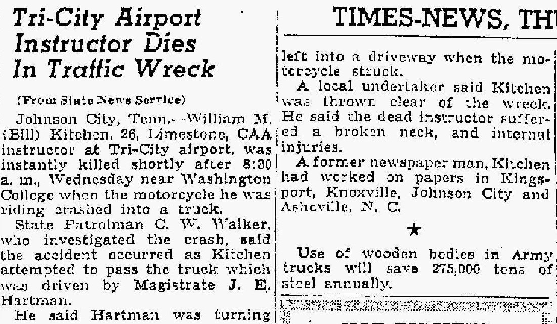 Tri-city airport instructor dies in traffic wreck. Johnson City, Tenn. – William M. (Bill) Kitchen, 26, Limestone, CAA instructor at Tri-City airport was instantly killed shortly after 3:30 a.m. Wednesday near Washington College when the motorcycle he was riding crashed into a truck. State patrolman C.W. Walker, who investigated the crash, said the accident occurred as Kitchen attempted to pass the truck which was driven by Magistrate J.E. Hartman. He said Hartman was turning left into a driveway when the motorcycle struck. A local undertaker said Kitchen was thrown clear of the wreck He said the dead instructor suffered a broken neck, and internal injuries. A former newspaper man, Kitchen had worked on papers in Kingsport, Knowville, Johnson City and Asheville, N.C.