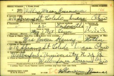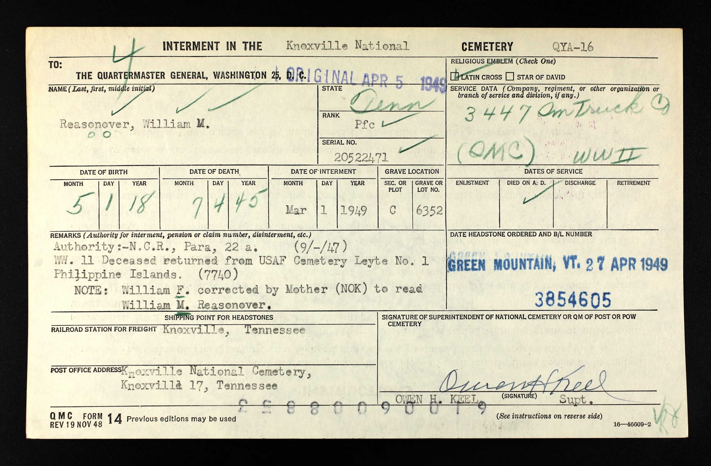 William Mason Reasonover was born on 1 May 1918. He was the son of Elijah Guthrie Reasonover and Emma M. Cummings. He was the husband of Gladys Elizabeth Armstrong and father of William Edward Reasonover and Alva Delores Reasonover.