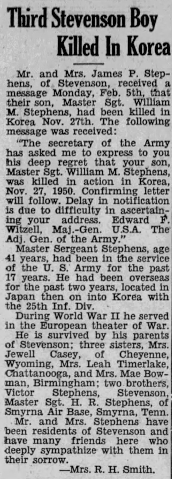 Mr. and Mrs. James P. Stephens of Stevenson, received a message Monday, Feb. 5th, that their son, Master Sgt. William M. Stephens, had been killed in Korea Nov. 27th. The following message was received: “The secretary of the Army has asked me to express to you his deep regret that your son, Master Sgt. William M. Stephens, was killed in action in Korea, Nov. 27, 1950. Confirming letter will follow. Delay in notification is due to difficulty in ascertaining your address. Edward F. Witzell, Maj.-Gen. U.S.A. The Adj. Gen. Of the Army.”