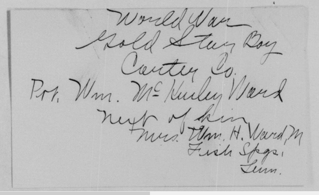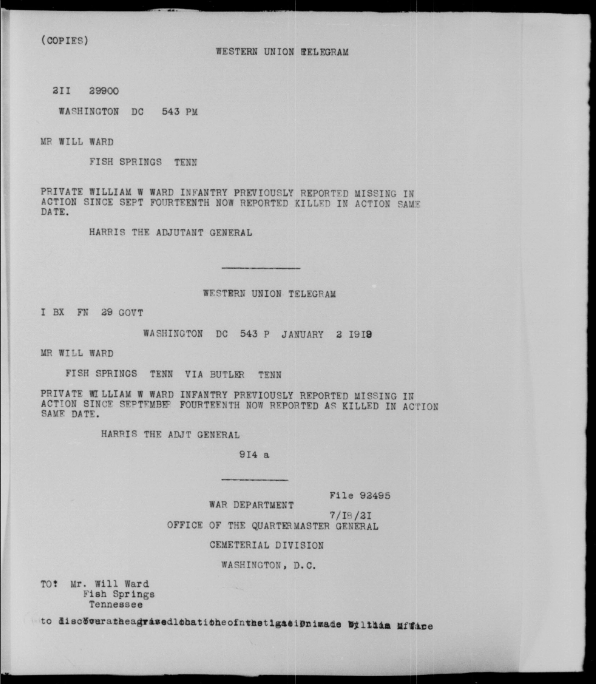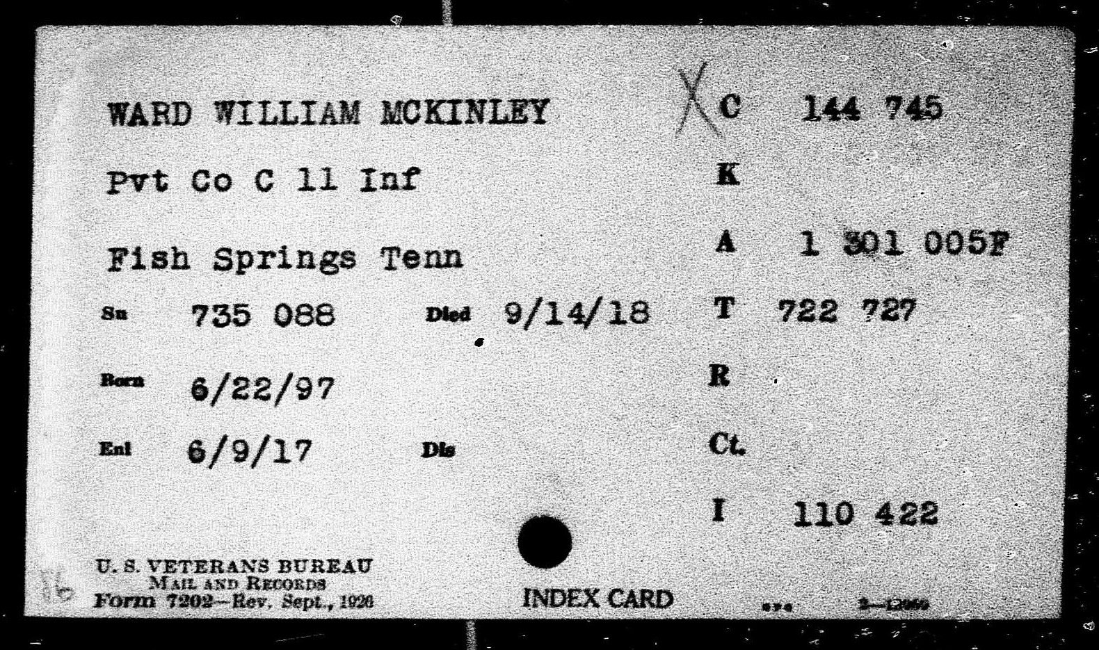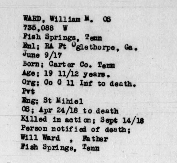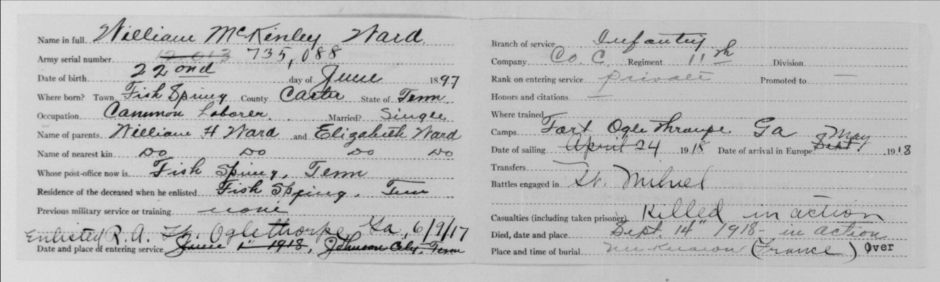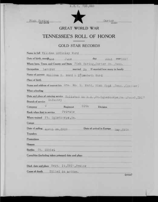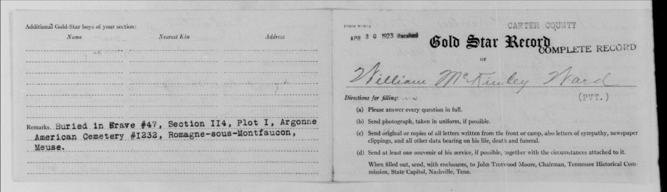 William McKinley Ward was born in January 1898 in Fishsprings, Carter County, TN. He was the son of William Hamilton Ward and Elizabeth Amanda Potter. He was killed in action at the age of 19. He is buried in plot G, row 29, grave 5, Meuse-Argonne American Cemetery, Romagne, France.