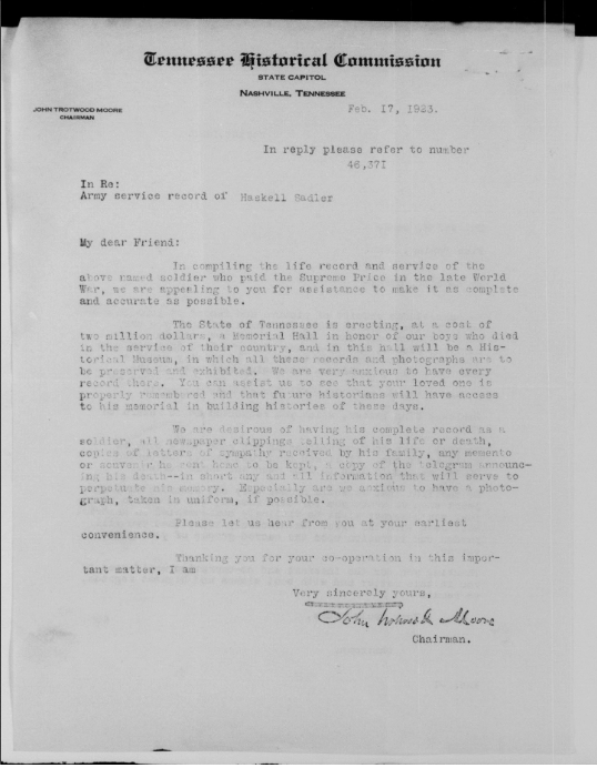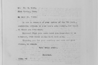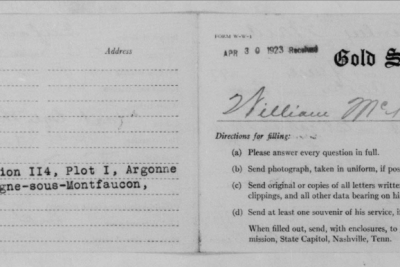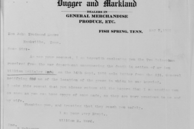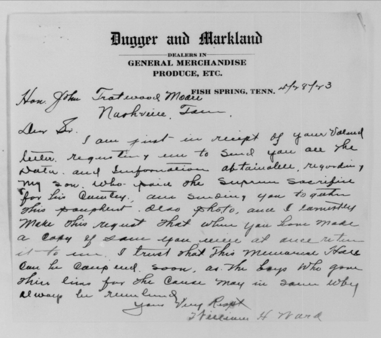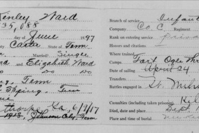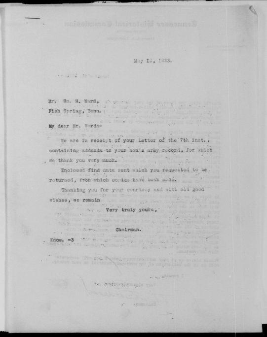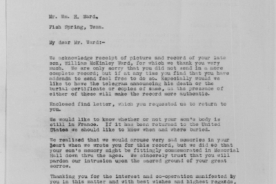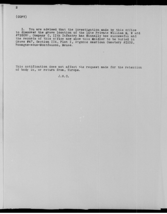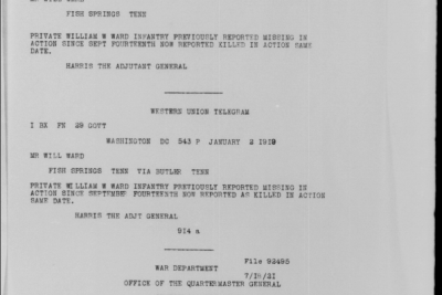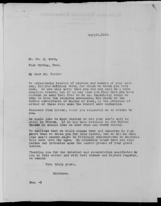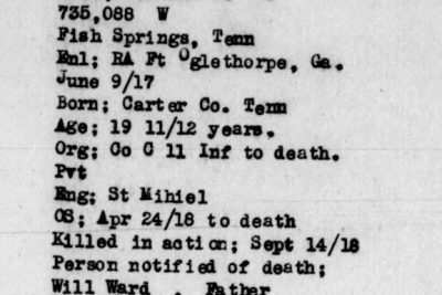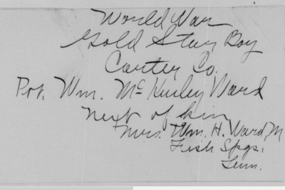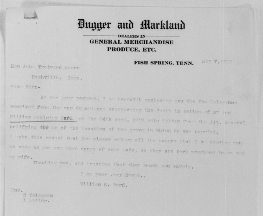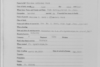 William McKinley Ward was born in January 1898 in Fishsprings, Carter County, TN. He was the son of William Hamilton Ward and Elizabeth Amanda Potter. He was killed in action at the age of 19. He is buried in plot G, row 29, grave 5, Meuse-Argonne American Cemetery, Romagne, France.