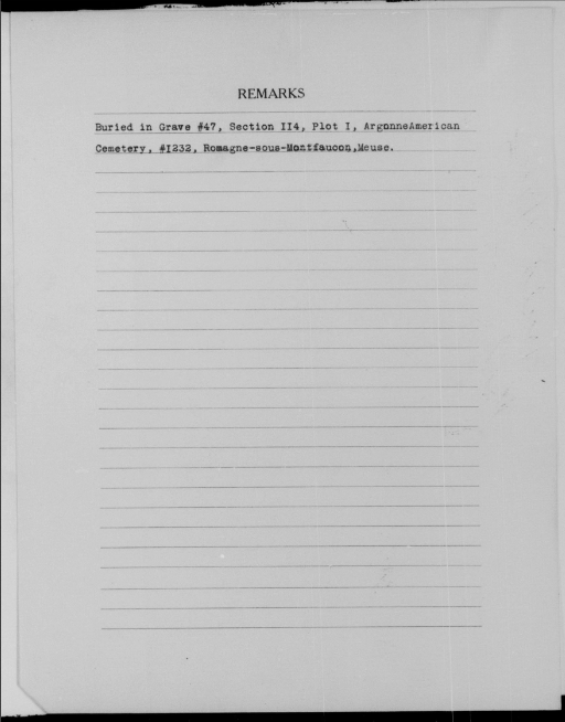 - Burial/Memorial Location: Meuse-Argonne American Cemetery, Romagne, France