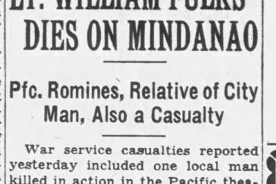 A veteran of nine years’ army duty with the field artillery, cavalry, medical corps, coast artillery and anti-aircraft units, Lt. Fulks was serving with an infantry group when he was killed in action June 21 on Mindanao Island. He was stationed with the Sixth Cavalry at Fort Oglethorpe for some time. A resident of Chattanooga for several years, Lt. Fulks is survived by his wife, three children, Sandra, 5; Billy, 3½; and Beck, 2; four sisters and four brothers, J.S. Fulks, Johnson City, tenn.; R.D. Fulks, Raleigh, N.C.; Lester H. Fulks, Harriman, Tenn., and Charles E. Fulks of the Sanitary Laundry, Rockwood, Tenn. He was a member of the First Christian Church of Rockwood.