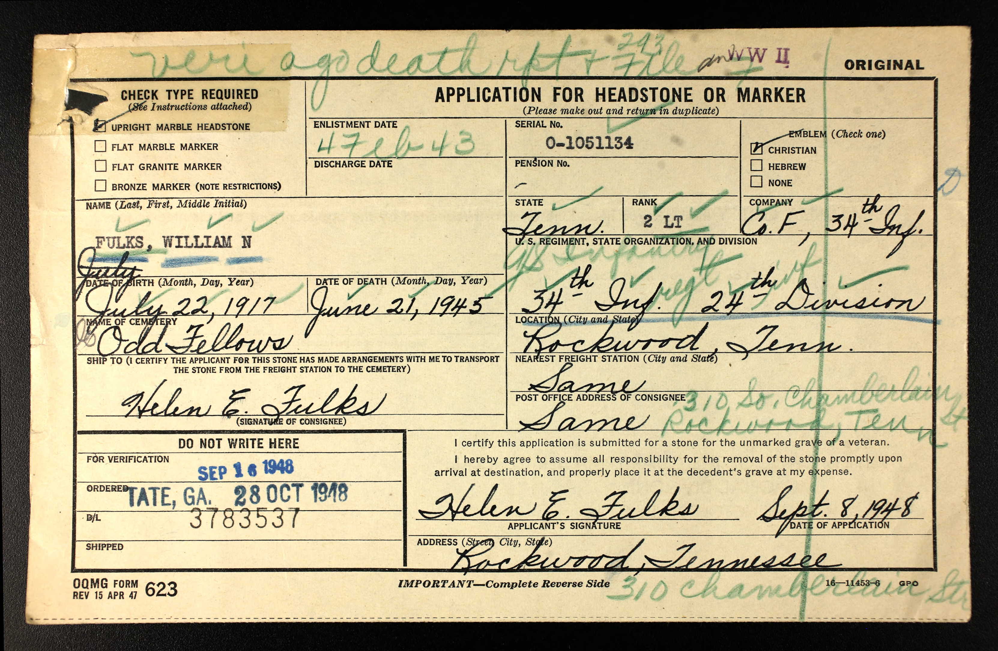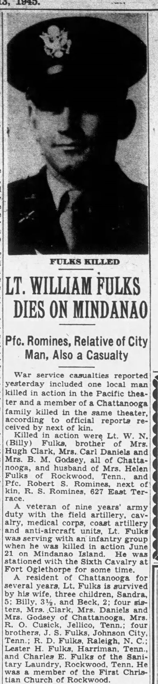 Killed in action is Lt. W.N. (Billy) Fulks, brother of Mrs. Hugh Clark, Mrs. Carl Daniels and Mrs. B.M. Godsey, all of Chattanooga, and husband of Mrs. Helen Fulks of Rockwood, Tenn.