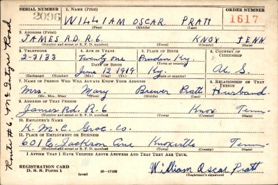 William Oscar “Dub” Pratt was born in Pruden, Kentucky, the son of Henry Odia Pratt and Nola Wilson. Brother of Mildred H. Pratt, Henry O. Pratt, Burrel R. Pratt, James L. Pratt, and Fay L. Pratt. He was married to Martha Emaline Brewer and the father of Tommy Wayne Pratt, Arnold Eugene Pratt, Shirley Ross Pratt, Nancy Ann Pratt and William Oscar Pratt Jr.