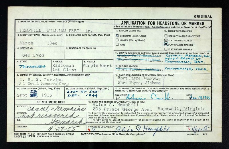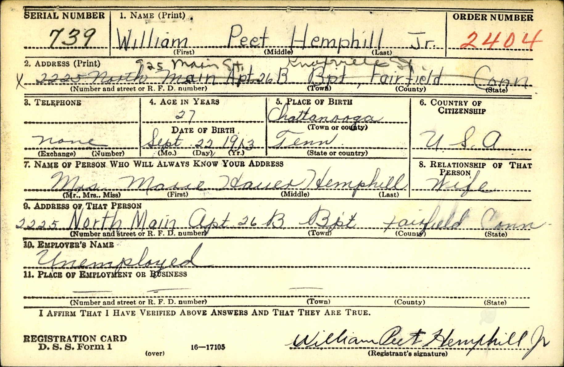 William Peet Hemphill, Jr. was born on 22 September 1913, the son of William Peet Hemphill and Alice Houston Campbell. Husband of Marie Hauer. Brother of Mrs. R.B. Darling, Hopewell, Va. Hempwell volunteered in the naval reserve in March, 1942, and received his radio training at New London, Conn. He is a graduate of the McCallie School and attended the University of Chattanooga.