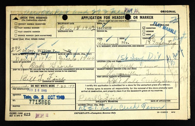 He enlisted for service in December, 1942 and sailed for England May 14, 1943. He was with the First Division when the army fought through Sicily. He was killed in action on 6 June 1944 on D-Day on the Normandy beach in France.