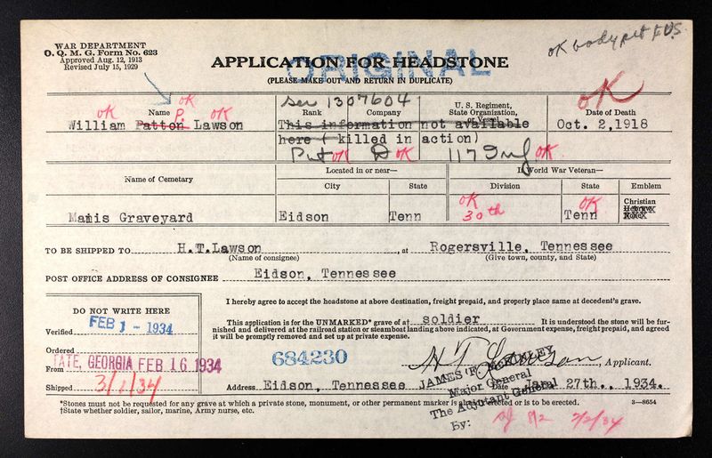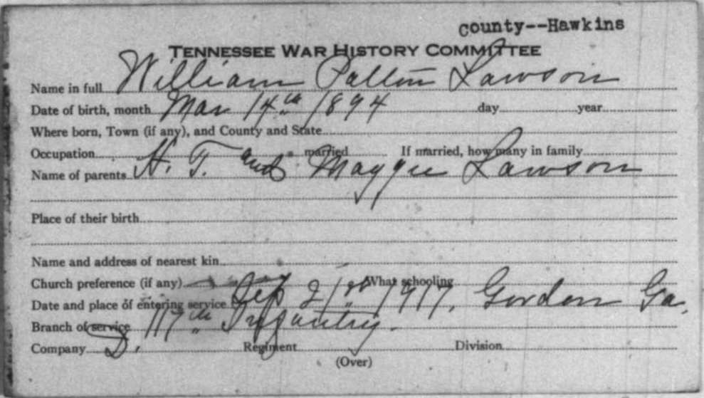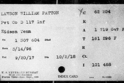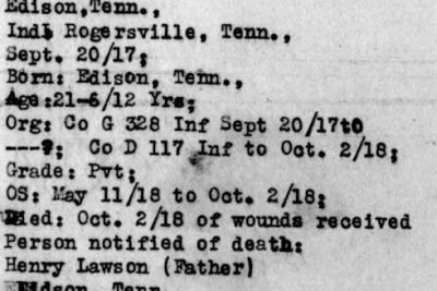 He was Killed in Action on the Hindenburg Line 2 October 1918. Pvt Lawson is buried at Manis Cemetery, Eidson, TN