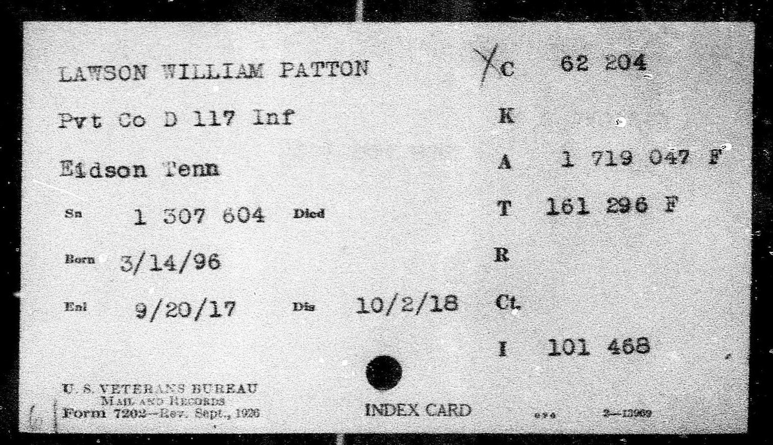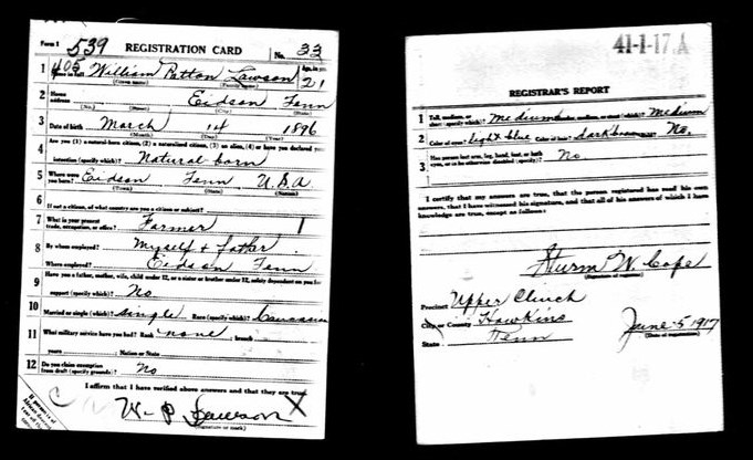 William Patton Lawson was born 14 March 1896, Eidson, Tennessee to Henry Thurman Lawson and Margaret L. McDavid.