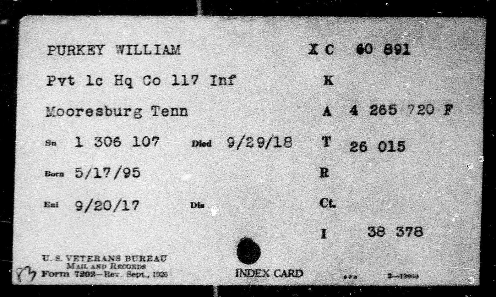 William Ephram Purkey was born in Sneedville, Tennessee 17 May 1895 to John Purkey and Sarah Claunce. He was killed in action 29 September 1918 at the age of 22, and is listed on the Tablets of the Missing, Somme American Cemetery, Bony, France.