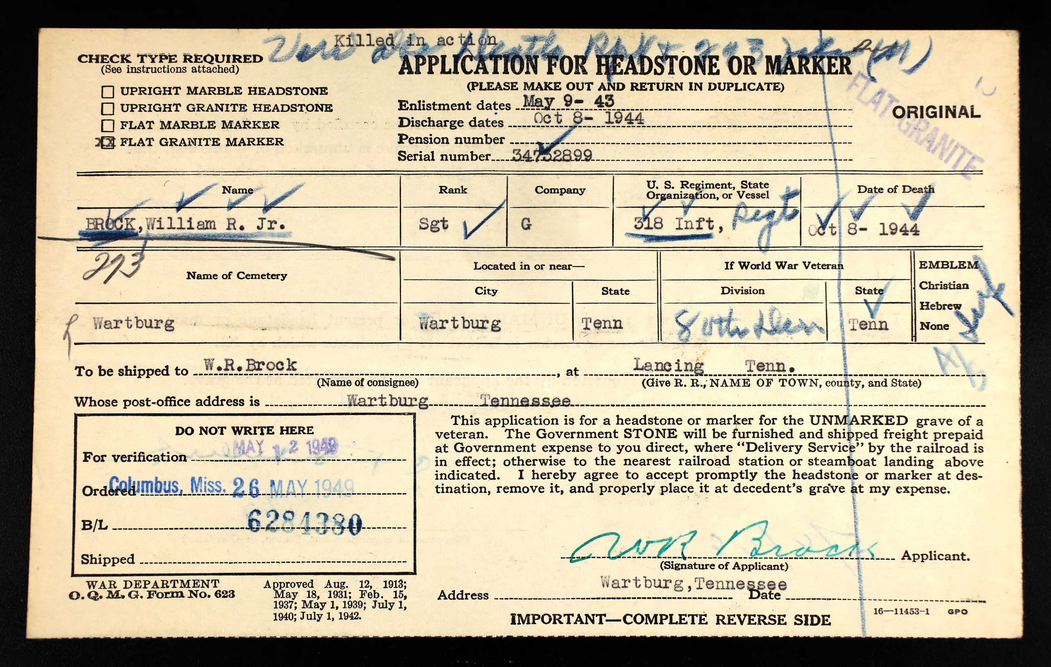 Sgt. William R. Brock Jr., age 20, was killed in action in France Oct. 8, 1944. He had been overseas less than two months. He was a member of the 69th Infantry. He was a member of the Wartburg Baptist Church and employed with TVA at the time he entered the service. He is survived by his parents, Mr. and Mrs. W.R. Brock; four brothers, Virgil L., Wartburg; Otto S., Detroit; Carl T. and Edward G. of Oak Ridge; four sisters, Mrs. C.A. Emerson, Wartburg; Mrs. R.F. Anderson of Richmond, Va.; Mrs. Ray C. Perkins of Lake City; and Mrs. Edward R. Pelfrey of Rockwood; and half sister, Delta Smith of Crossville.