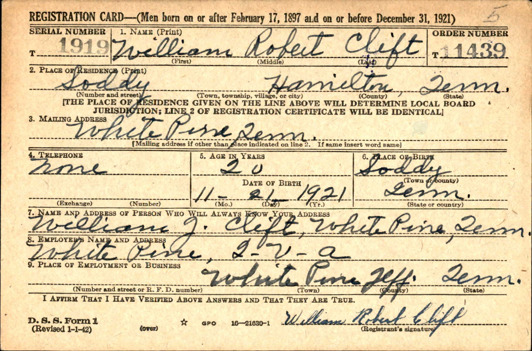 The War Department notified Mrs. Birdie Lee Gann Clift of Soddy March 6 that her husband, T/Sgt. William Robert Clift, had been killed Feb. 21 over Reedham, England, it became know yesterday. The telegram reported the death of Sgt. Clift gave no details. But from its statement that the death occurred “over” Reedham, England, it is assumed that it was the result of an air crash, possibly of a departing or returning bomber. Sgt. Clift is survived by his wife, a son, William Robert Clift Jr., 6 months; parents, Mr. and Mrs. Will Clift, Clinton, Tenn. He was a graduate of Soddy-Daisy High School and would have been in service two years in August.