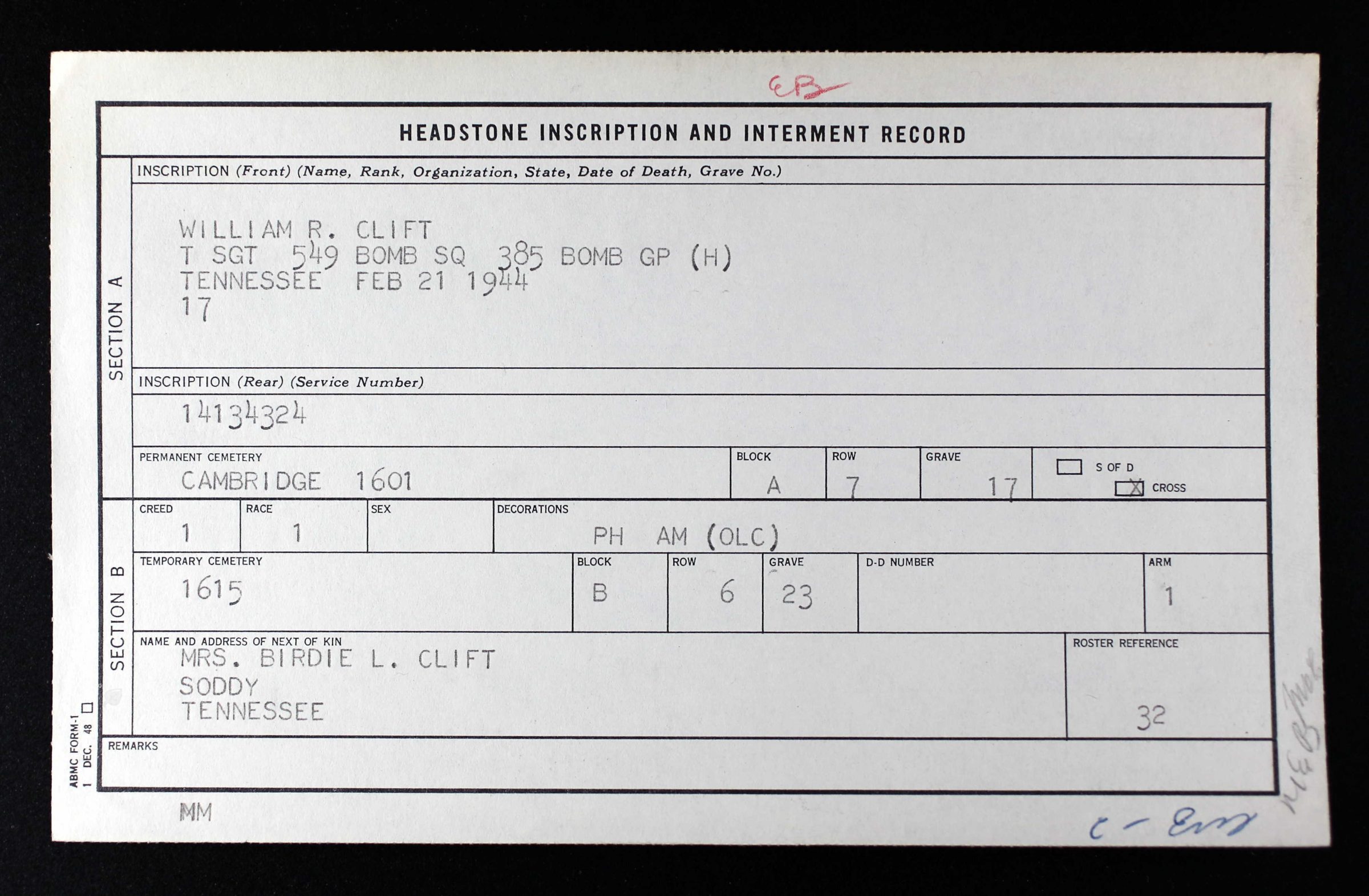 Technical Sergeant William Robert Clift, US Army Air Forces, was assigned to the 549th Bomber Squadron, 385th Bomber Group Heavy, flying a B-17G with serial number 42-37963 out of Great Ashfield, England.