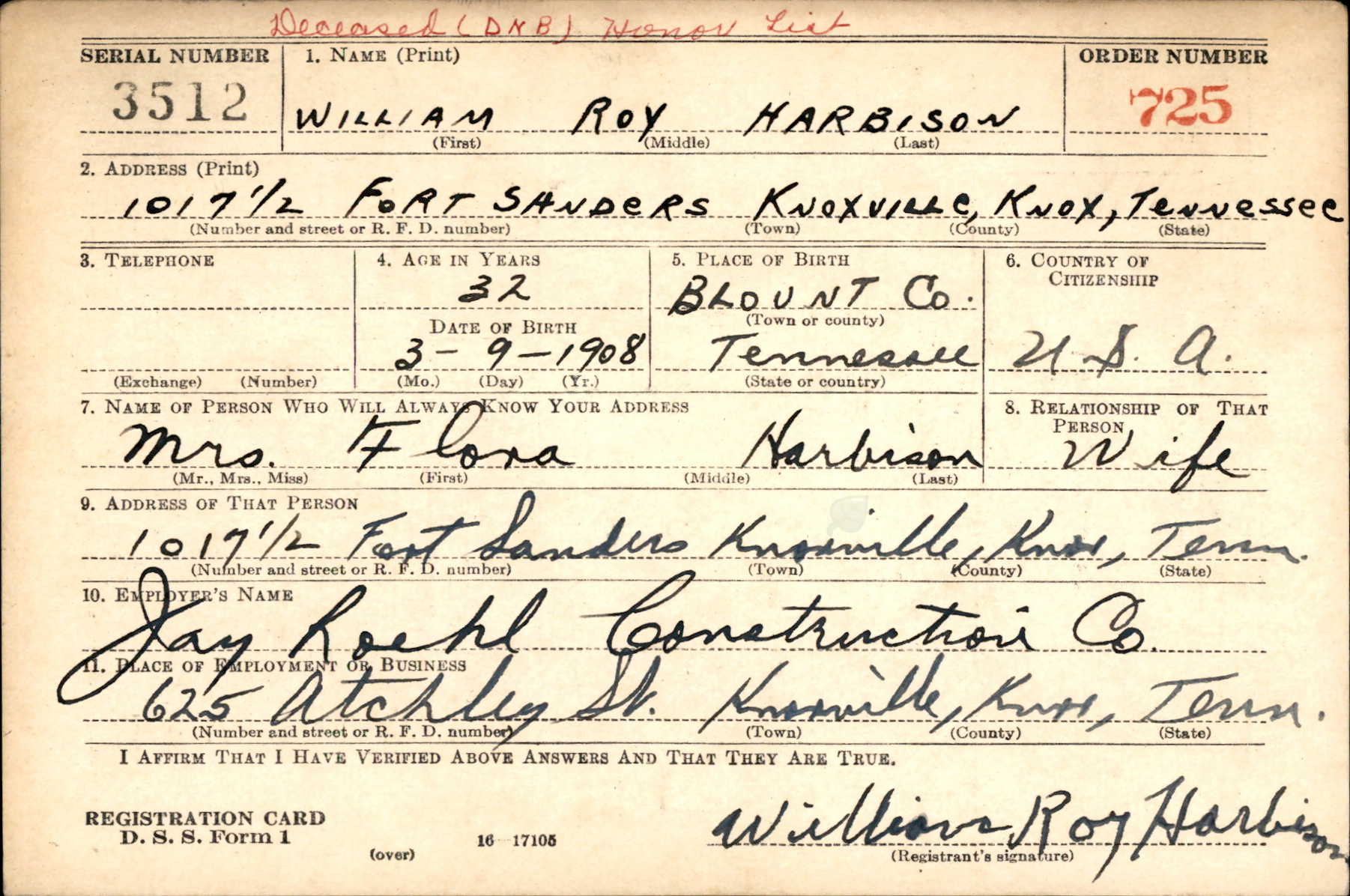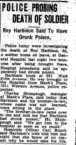 Pvt. William Roy Harbison, 35, of 551 West Fifth Avenue, stationed at Camp Van Dorn, Miss., died at 6:30 p.m. Wednesday at General Hospital. Survivors, widow, Mrs. Flora Harbison; sisters, Mrs. Elizabeth Morgan, Mrs. Janie Beeler, Mrs. Lillard Clouse, Miss Ruth Harbison and Mrs. Pearl Ogle; brother, John Harbison, Dubuque, Iowa. Body is at Weaver’s. Funeral arrangements will be made later.