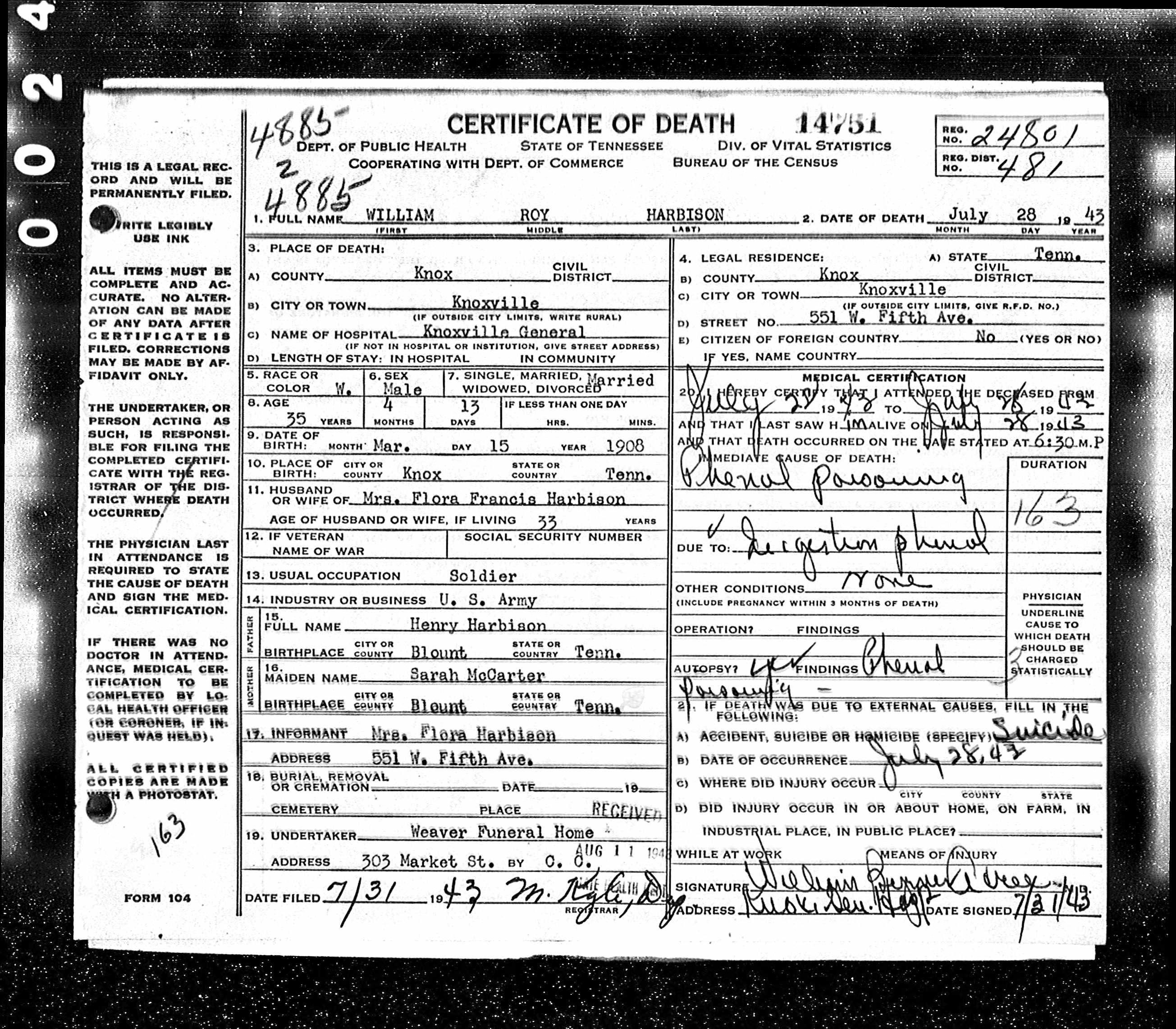 Pvt Harbison died of poisoning at Knoxville General Hospital in Knoxville.