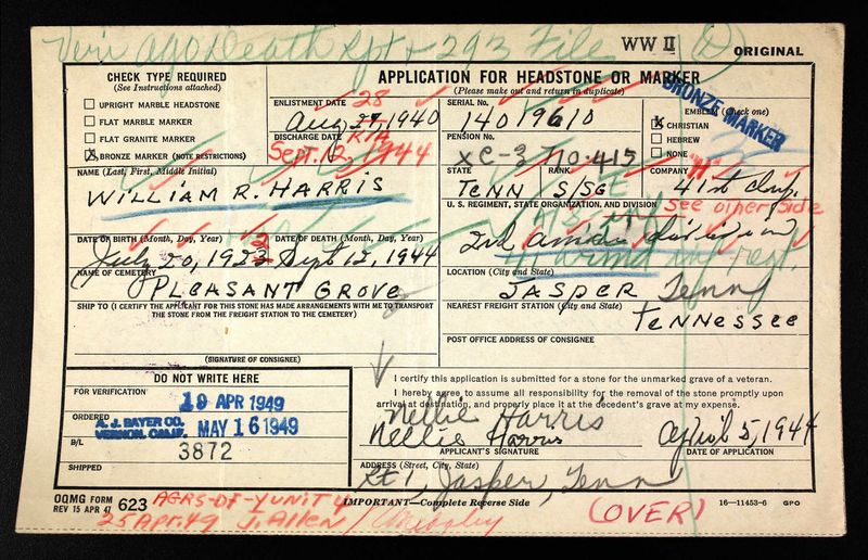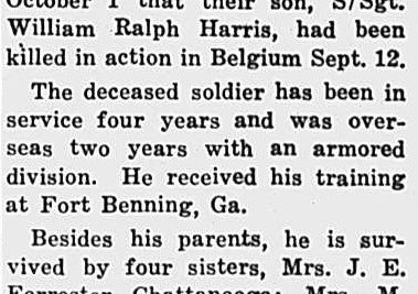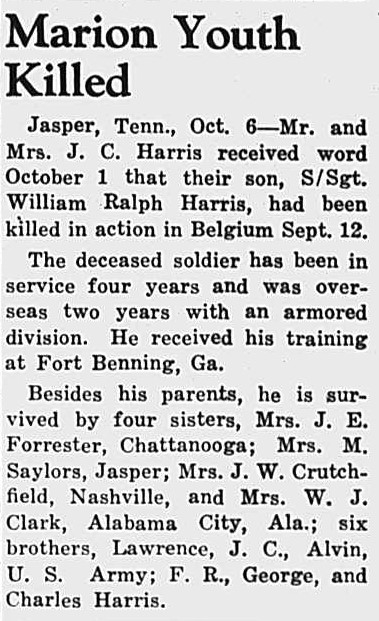 Mr. and Mrs. J.C. Harris received word October 1 that their son, S/Sgt William Ralph Harris, had been killed in action in Belgium Sept. 12. The deceased soldier has been in service four years and was overseas two years with an armored division. He received his traning at Fort Benning, Ga.