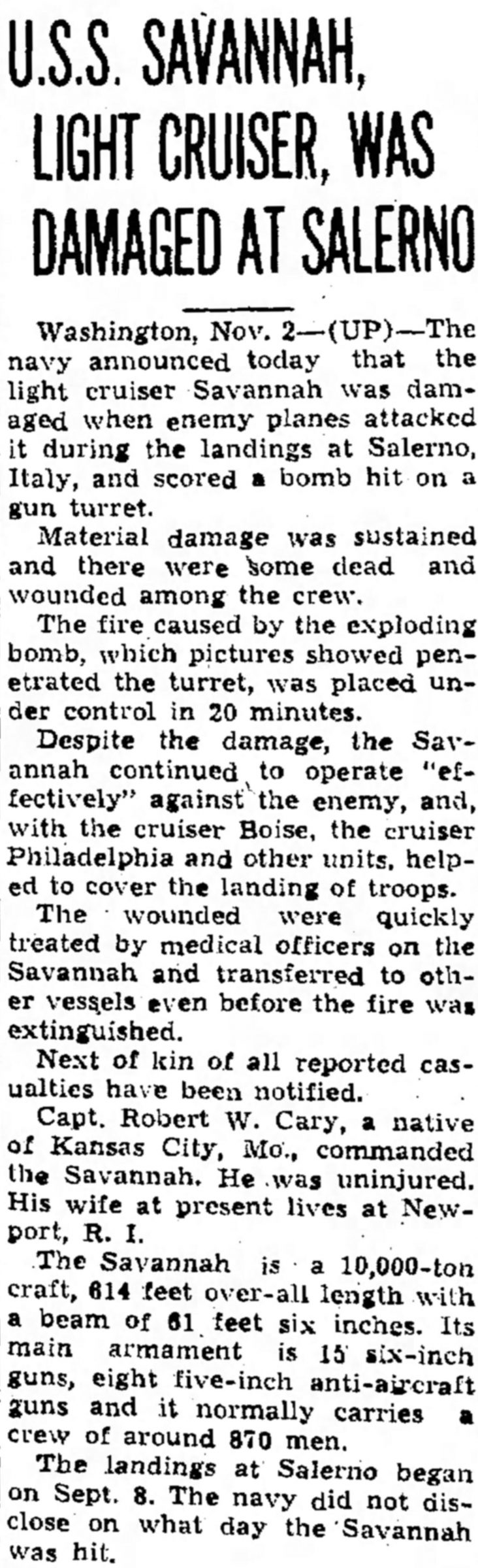 William Rye Stubblefield, gunner’s mate third class, was killed in action aboard the U.S.S. Savannah when that vessel was damaged by the Germans off the coast of Salerno Sept. 11, it was learned yesterday. Previously reported missing in action, Stubblefield’s death was confirmed by the navy in a message to his mother, Mrs. Mollie D. Stubblefield, 3209 Dodds Avenue. He was buried at sea off Malta, the message said. Stubblefield, who attended East Lake Grammar School, is survived by his mother; a brother, Buford Stubblefield, overseas in the United States Navy; a sister, Mrs. Velma Holland, 3209 Dodds Avenue, and a half-brother, Sherman Stubblefield of Rossville.
