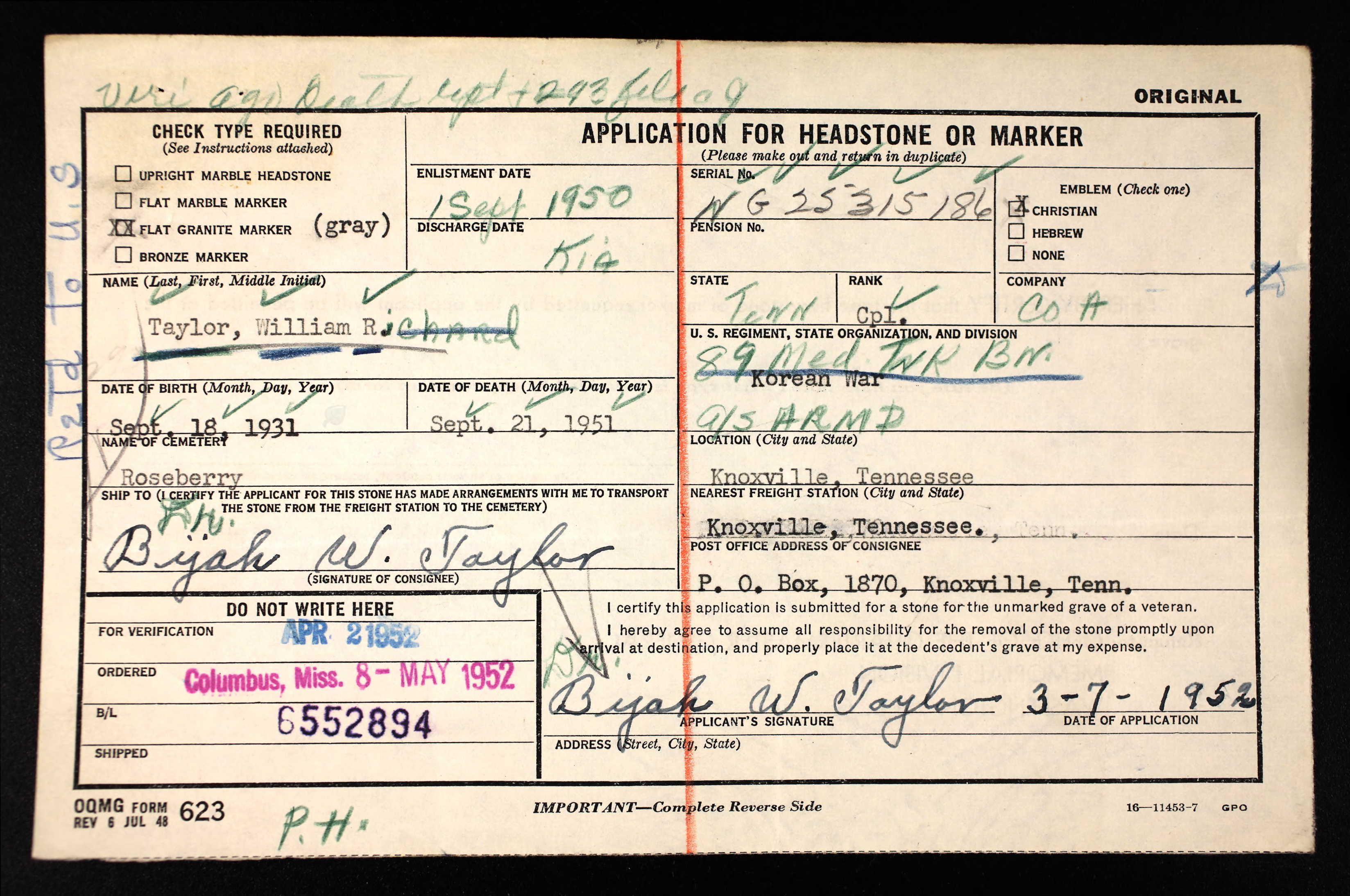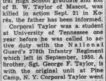 Corporal Taylor was repatriated to his hometown of Mascot and funeral services were held March 3, 1952 at McCarty Funeral Home Chapel. American Legion Post Number 2 was in charge of services at Roseberry Cemetery. Pallbearers were the ROTC Cadets at the University of Tennessee.