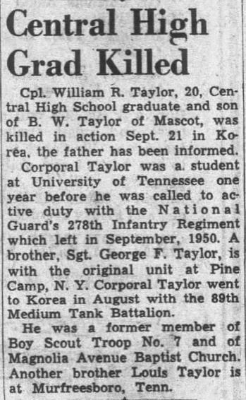 William was a graduate of Central High School, member of Boy Scout Troop number seven, and a member of Magnolia Avenue Baptist Church. He enrolled at the University of Tennessee and was a student one year before he was called to active duty with the National Guard 278th Infantry Regiment which left Knoxville for Korea in September 1950.