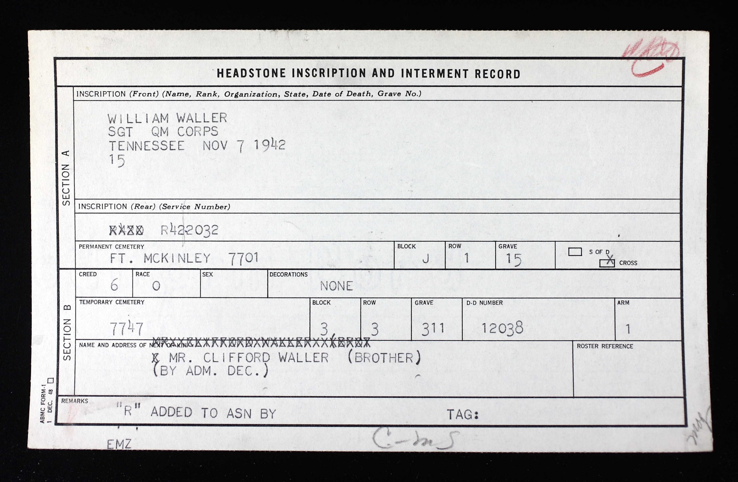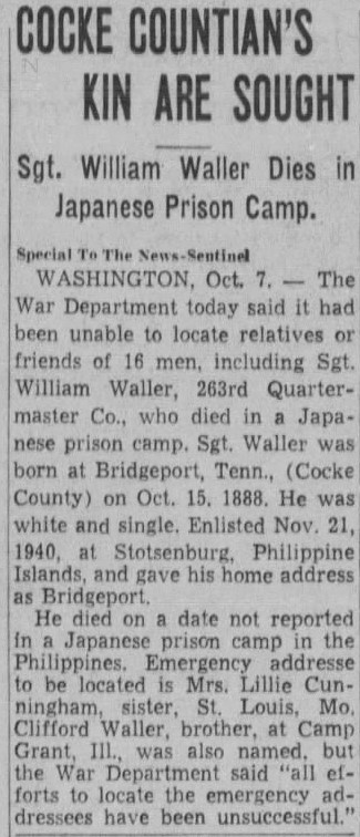 The War Department today said it had been unable to locate relatives or friends of 16 men, including Sgt. William Waller, 263rd Quartermaster Co., who died in a Japanese prison camp. Sgt. Waller was born at Bridgeport, Tenn., (Cocke County) on Oct. 15, 1888. He was white and single. Enlisted Nov. 21, 1940 at Stotsenburg, Philippine Islands, and gave his home address as Bridgeport. He died on a date not reported in a Japanese prison camp in the Philippines. Emergency addresse to be located is Mrs. Lillie Cunningham, sister, St. Louis, Mo. Clifford Waller, brother, at Camp Grant, Ill, was also named, but the War Department said “all efforts to locate the emergency addressees have been unsuccessful.”