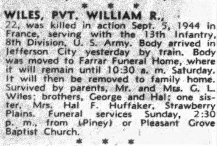 Private First Class Wiles is buried at Woodlawn Cemetery, Knoxville.