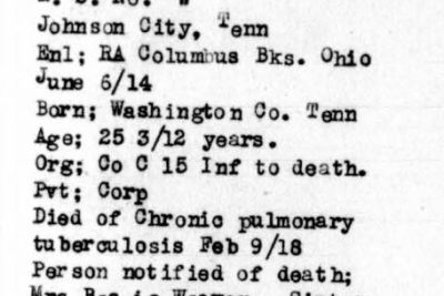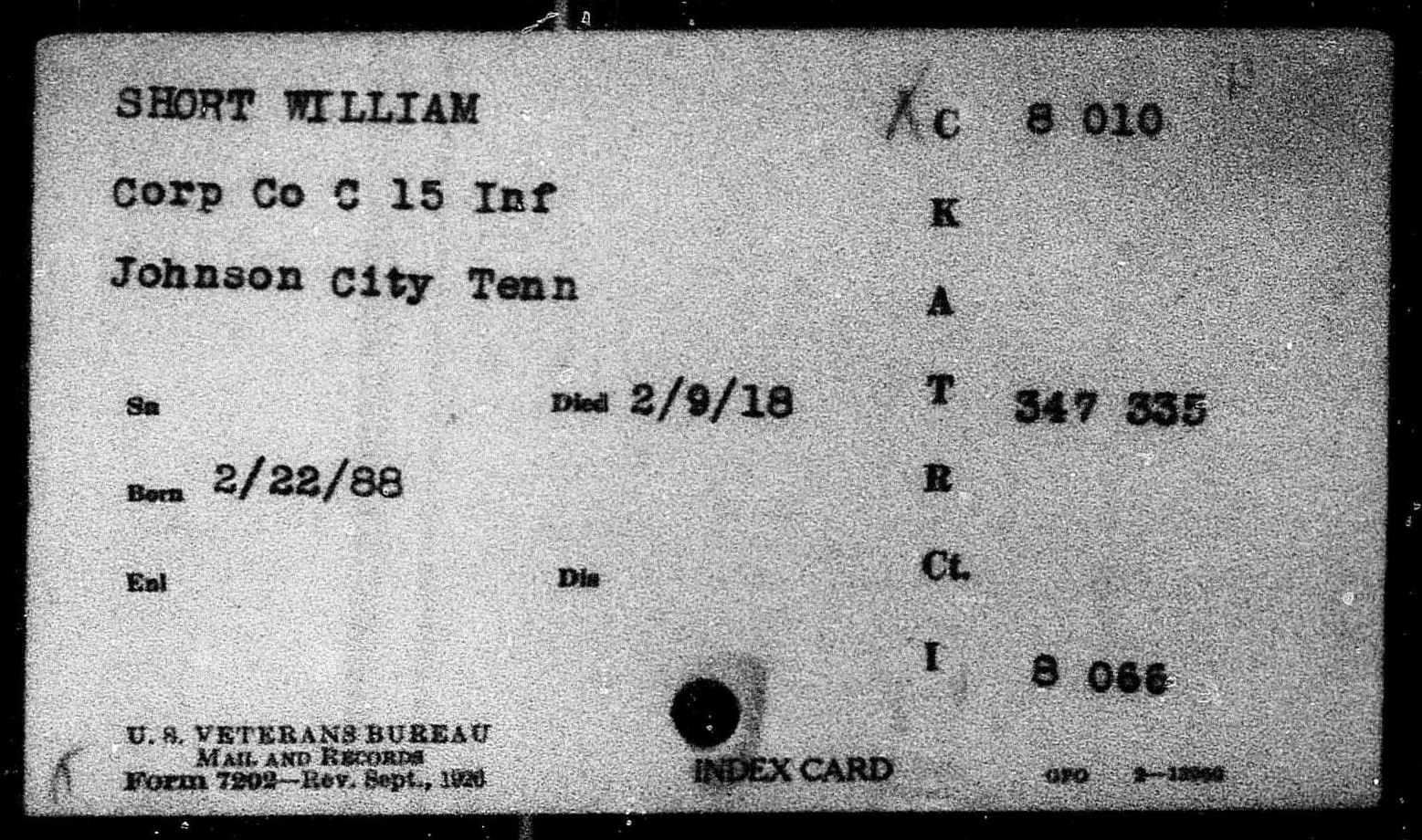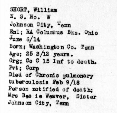 William Short was born in Washington County, Tennessee, son of Solomon David Short and Mary E. “Mollie” Collier. He joined the Army at the age of 25, enlisted in the United States Army on 6 June 1914 at Columbus Barracks, Ohio. He died of chronic pulmonary tuberculosis on 9 February 1918.