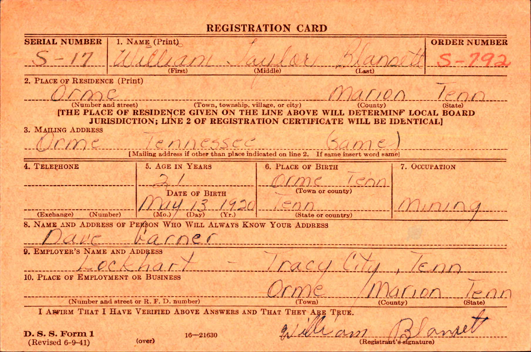 William Taylor Blansett was the son of Arthur Scott Blansett and Martha Daisy “Mattie” Dawson. He was married to Bertha Mae Goff. His brother Edward Franklin Blanset was killed in action at Okinawa in Japan.