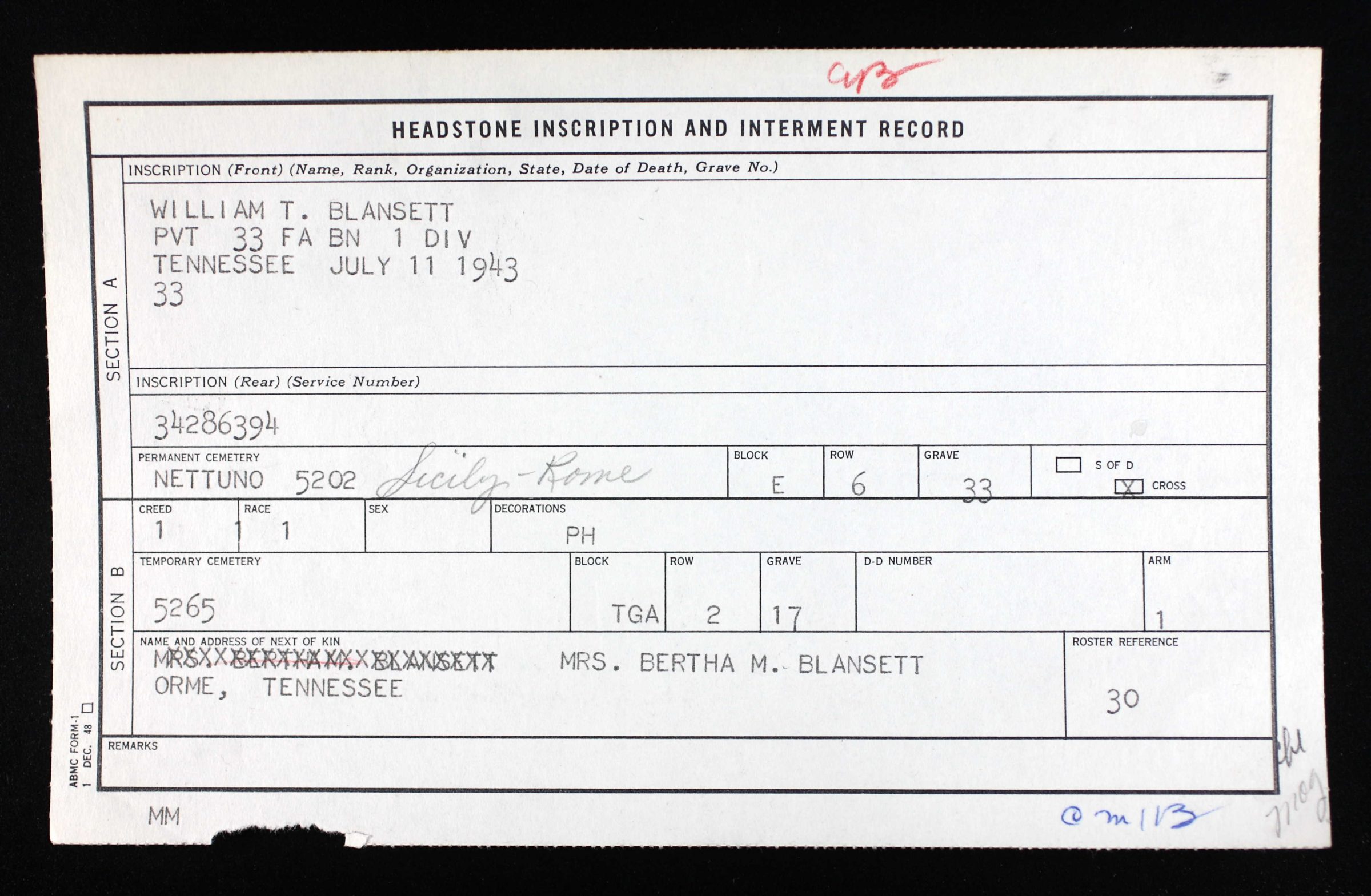 Private William T. Blansett was assigned to the 33rd Field Artillery Battalion, 105mm, 1st Infantry Division. At the time of his death the Division had landed on Sicily 10 July 1943 against fierce resistance. He was killed in action 11 July 1943, and is interred at E,6,33, Sicily-Rome American Cemetery, Nettuno, Italy.