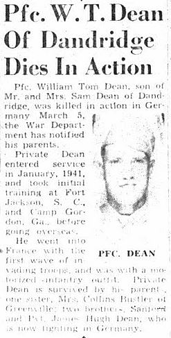 Pfc. William T. Dean, age 29, was killed in action March 5, 1945, while serving with the Eighth Infantry, Fourth Motorized Division in Germany. The remains arrived in Jeferson City and were removed to the Farrar Funeral Home in Dandridge.