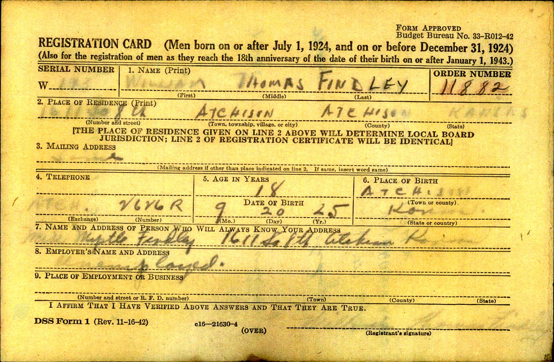 William Thomas Findley was born in Atchison, Kansas, the son of Vail Eugene Findley and Ruth Inez Thomas.
