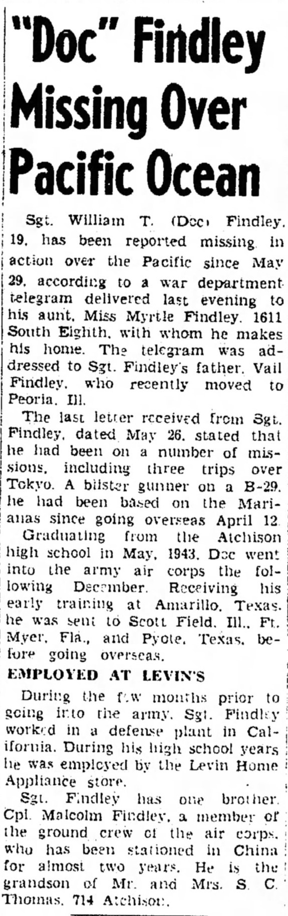The last letter received from Sgt. Findley, dated May 26, stated that he had been on a number of missions, including three trips over Tokyo. A blister gunnero n a B-29, he had been base don the Marianas since going overseas April 12. Graduating from the Atchison high school in May, 1943, Doc went into the army air corps the following december. Receiving his early training at Amarillo, Texas, he was sent to Scott Field, Ill., Ft. Myer, Fla. And Pyote, Texas, before going overseas.