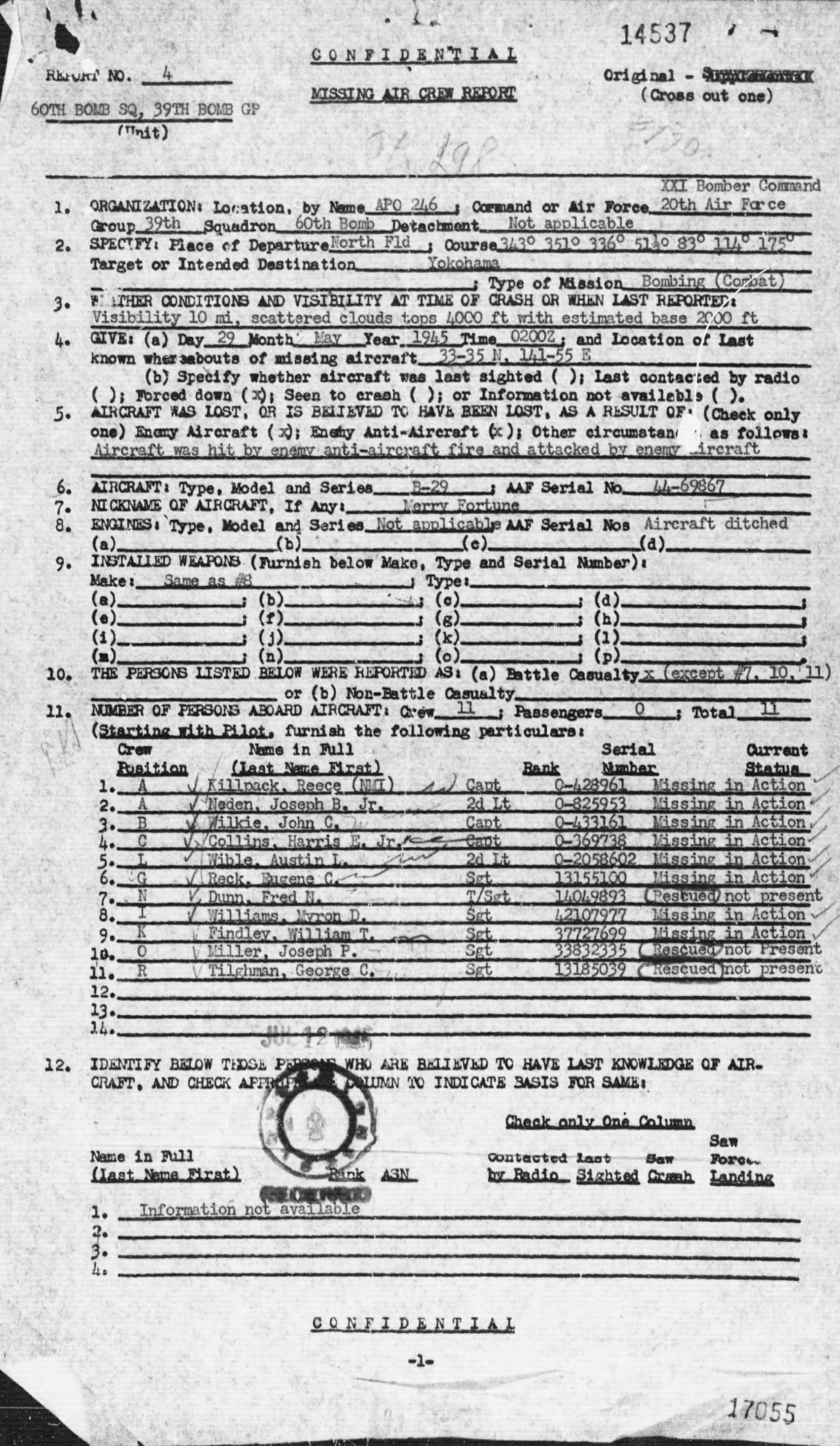 Aircraft B-29 with serial number 44-69867 was on a bombing mission to Yokohama. The aircraft received a direct flak burst over the target after bombs away. The entire control system was shot away with the exception of the trim tabs on the elevators. The landing gears extended and flaps came down at approximately 20-25 degrees. The original course to return to base was maintained. Soon afterwards the aircraft went into a dive at 19,000 feet and pulled out at 12,000 feet. The pilot was able to straighten out by means of the elevator trim tabs but in so doing an erratic course was flown. Approximately 100 miles off the Japanese Coast the verbal order to bail out was carried out. After leaving the formation the distressed aircraft was jumped by 10 Japanese fighters. The call for help on VHF was radioed to other B-29`s in the vicinity. Five attacks were made at the stricken aircraft by Tojos in pairs. Two B-29`s arrived to drive the fighters off. Later the Radio Operator contacted a submarine (Razor Back) which was approximately 30 miles off the coast. He also contacted a buddy B-298 and gave them their position.