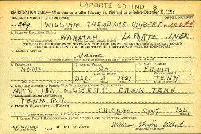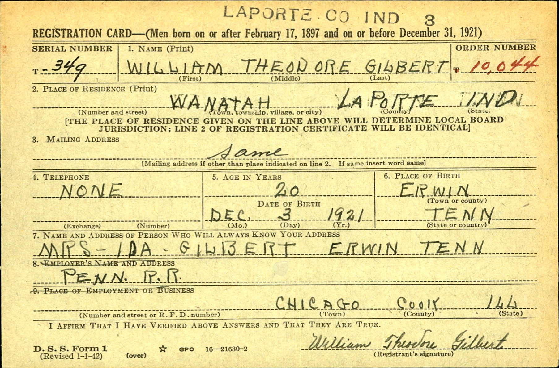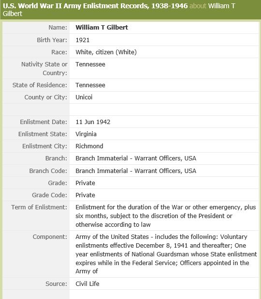 William Theodore Gilbert was born on 3 December 1921, Unicoi County, Tennessee. The son of Earl Alvin Gilbert Sr. and Ida Geneva Lewis.
