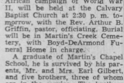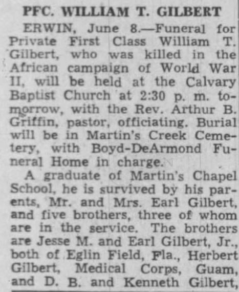 Funeral for Private First Class William T. Gilbert, who was killed in the African campaign of World War II, will be held at the Calvary Baptist Church. Burial will be in Martin’s Creek Cemetery. A graduate of Martin’s Chapel School, he is survived by his parents, Mr. and Mrs. Earl Gilbert, and five brothers, three of whom are in the service. The brothers are Jesse M. and Earl Gilbert Jr., both of Eglin Field, Fla., Herbert D. Gilbert, Medical Corps, Guan, and D.B. and Kenneth Gilbert.