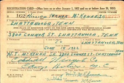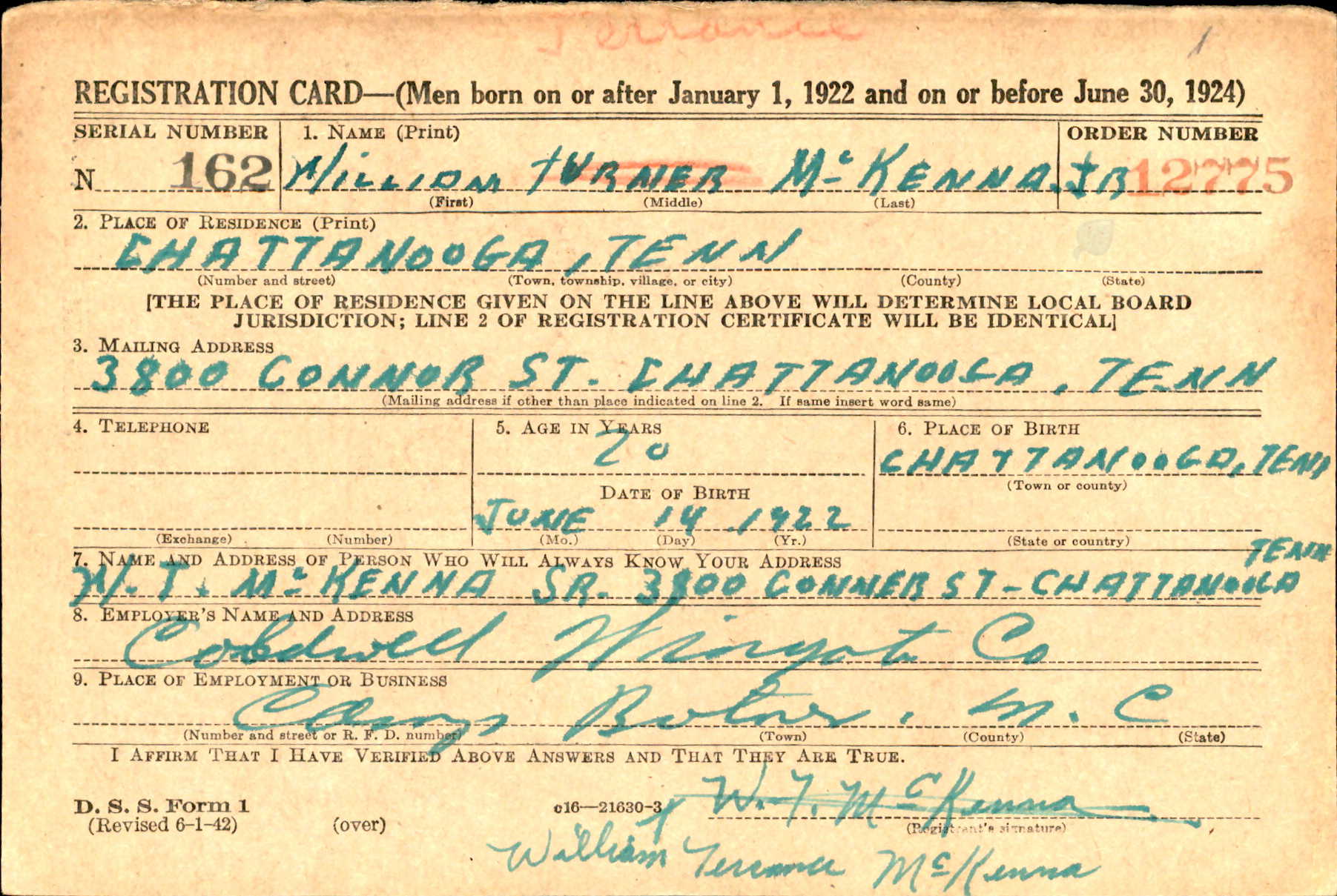 William Turner McKenna was born in Chattanooga, Tennessee to William Turner McKenna and Leona Creaseman.