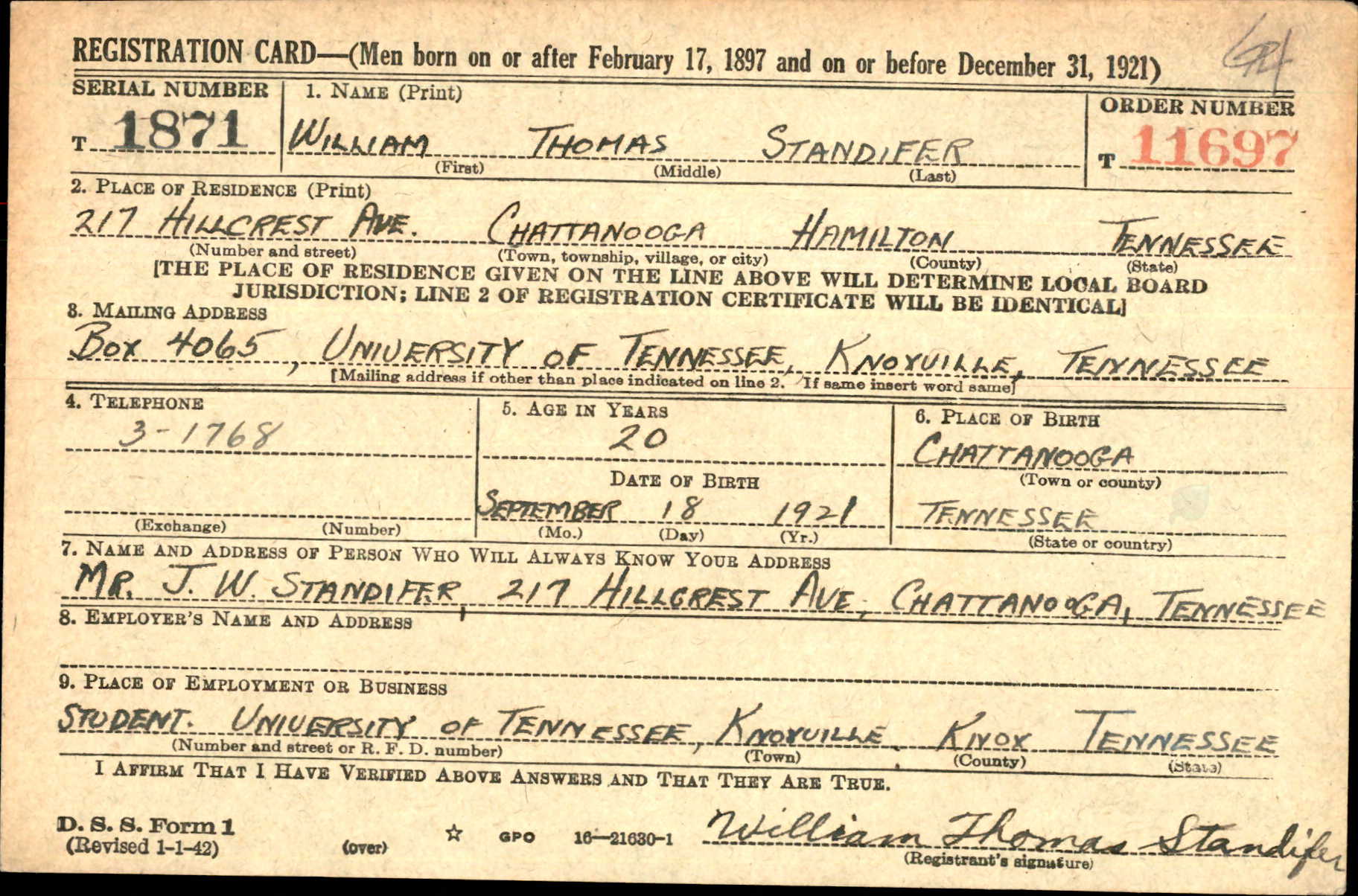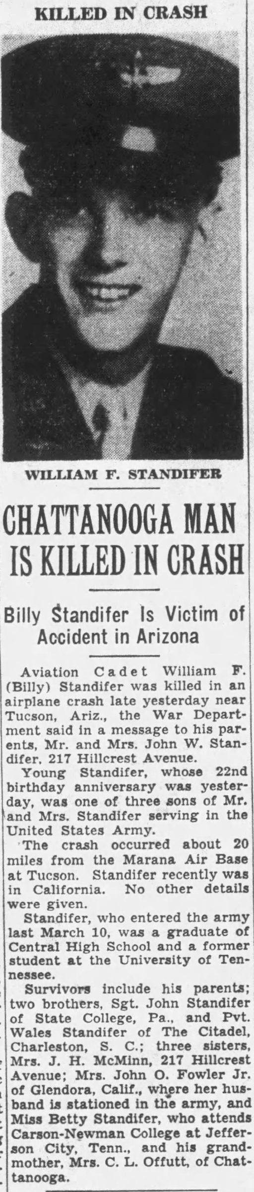 Aviation Cadet William F. (Billy) Standifer was killed in an airplane crash late yesterday near Tucson, Ariz., the War Department said in a message to his parents, Mr. and Mrs. John W. Standifer, 217 Hillcrest Avenue. Young Standifer, whose 22nd birthday anniversary was yesterday, was one of three sons of Mr. and Mrs. Standifer serving in the United States Army. The crash occurred about 20 miles from the Marana Air Base at Tucson. Standifer recently was in California. No other details were given. Standifer, who entered the army last March 10, was a graduate of Central High School and a former student at the University of Tennessee.