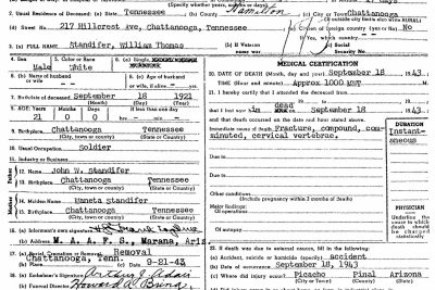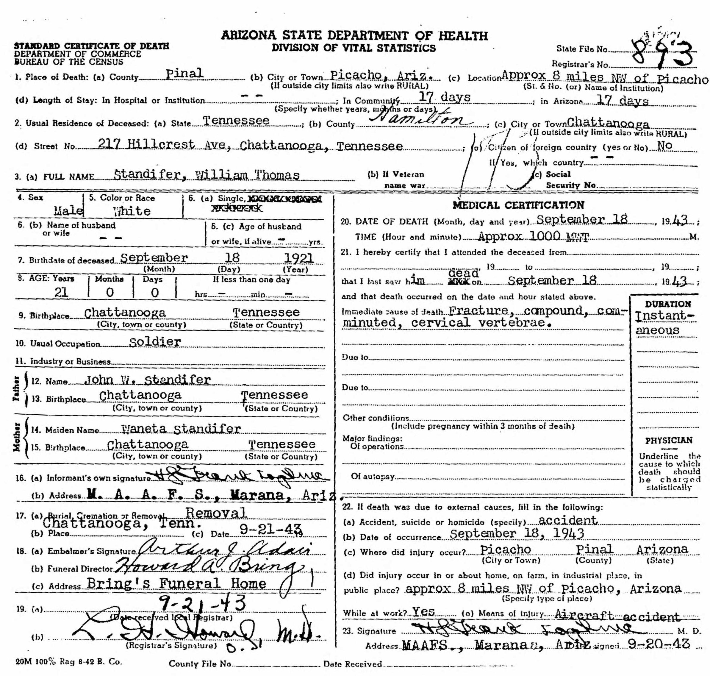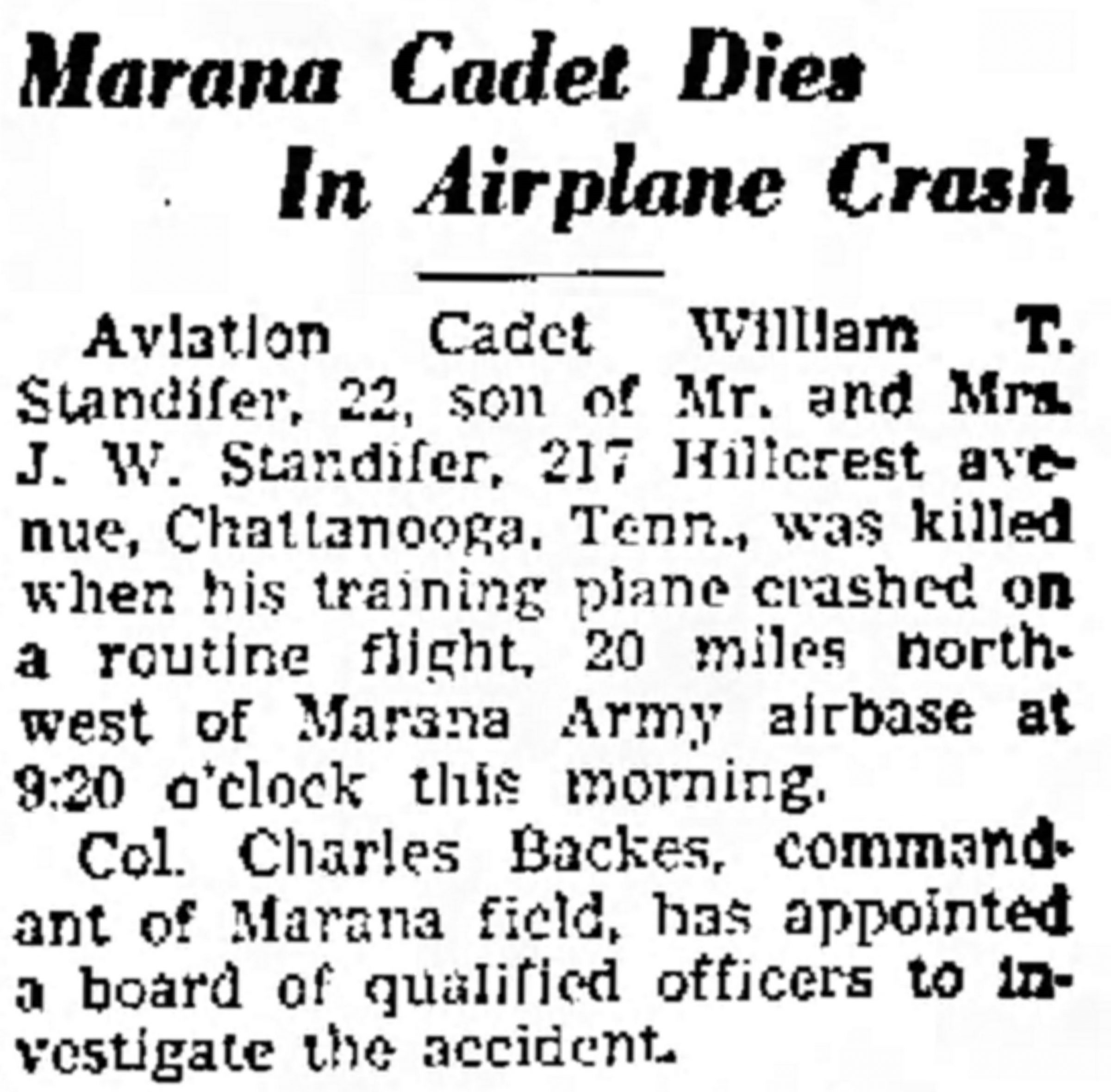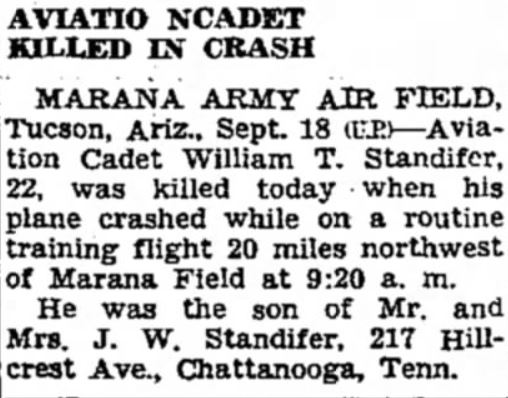 Marana Cadet dies in airplane crash – Aviation Cadet William T. Standifer, 22, son of Mr. and Mrs. J.W. Standifer, 217 Hillcrest avenue, Chattanooga, Tenn., was killed when his training plane crashed on a routine flight, 20 miles northwest of Marana Army airbase at 9:20 o’clock this morning.