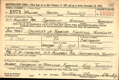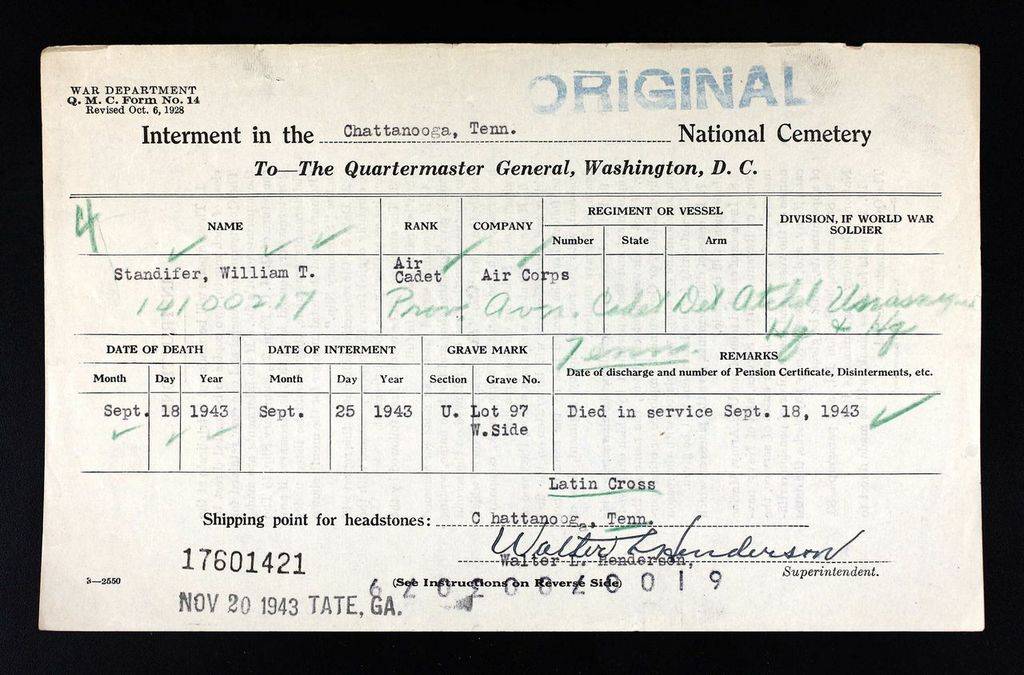 Survivors include his parents; two brothers, Sgt. John Standifer of State College, Pa. And Pvt. Wales Standifer of The Citadel, Charleston, S.C.; three sisters, Mrs. J.H. McMinn, 217 Hillcrest Avenue; Mrs. John O. Fowler Jr. of Glendora, Calif., where her husband is stationed in the army, and Miss Betty Standifer, who attends Carson-Newman College at Jefferson City, Tenn., and his grandmother, Mrs. C.L. Offutt, of Chattanooga.