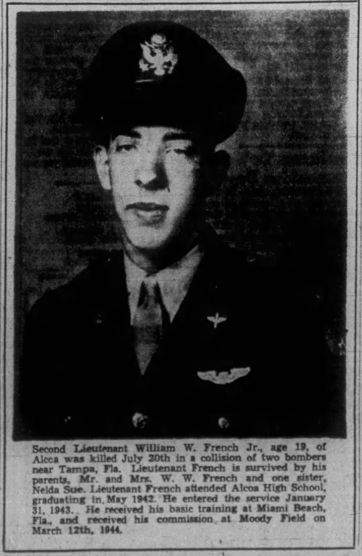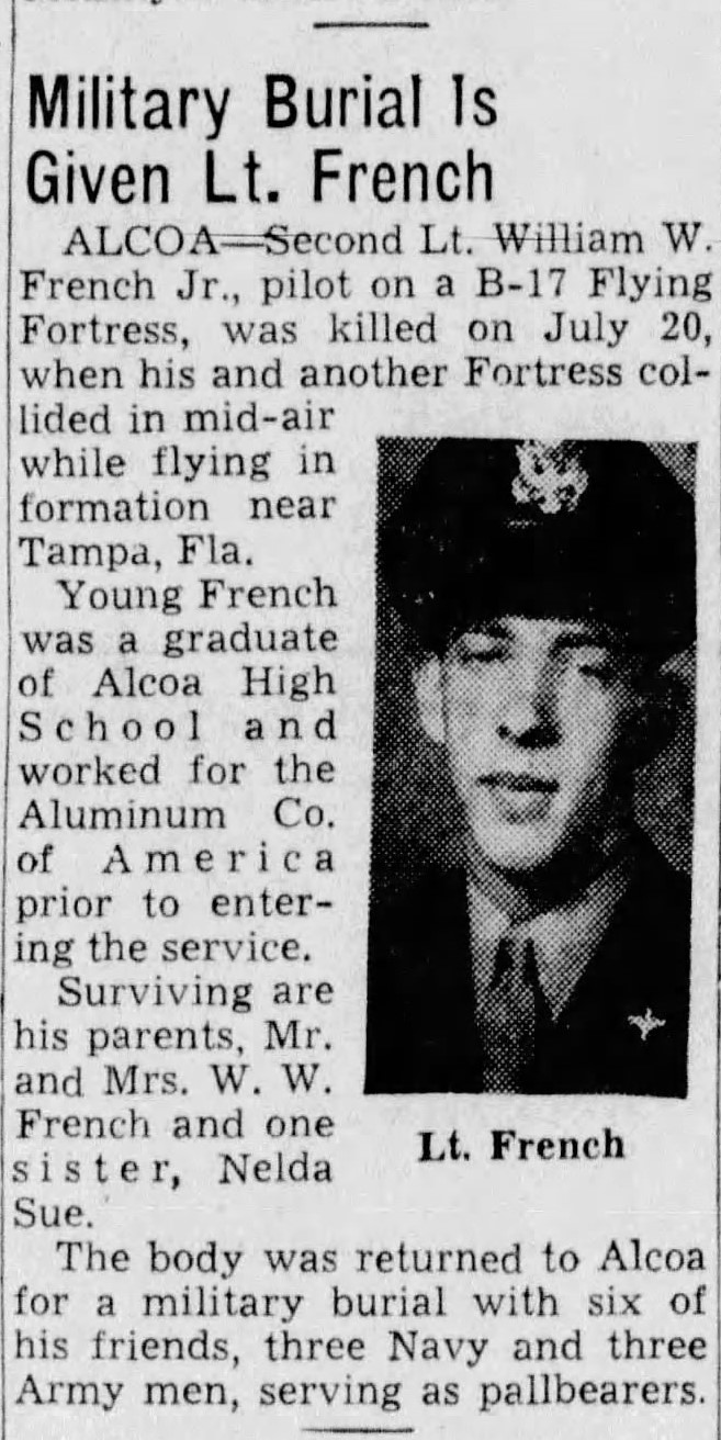 Alcoa- Second Lt. William W. French Jr., pilot on a B-17 Flying Fortress, was killed on July 20, when his and another Fortress collided in mid-air while flying in formation near Tampa, Fla. Young French was a graduate of Alcoa High School and worked for the Aluminum Co. of America prior to entering the service. Surviving are his parents, Mr. and Mrs. W.W. French and one sister, Nelda Sue.