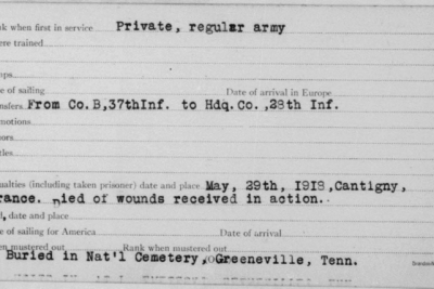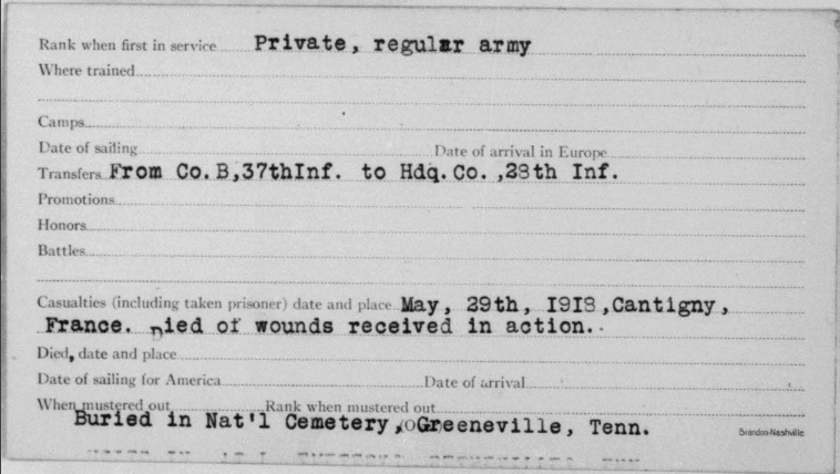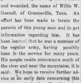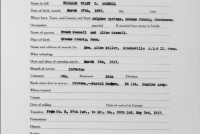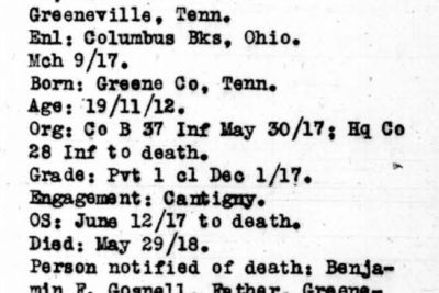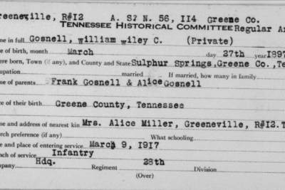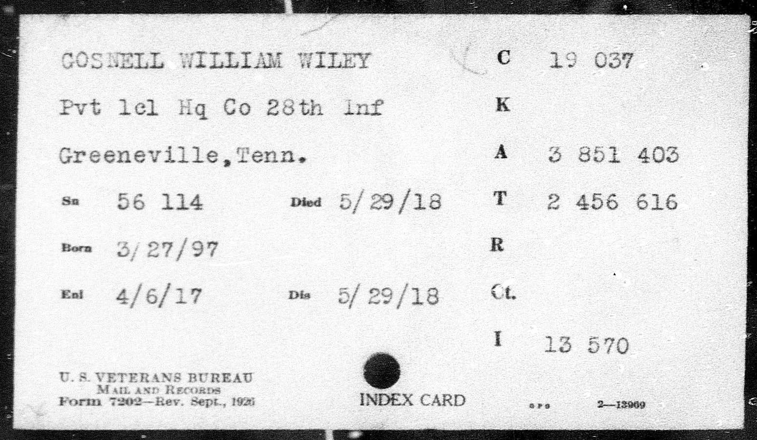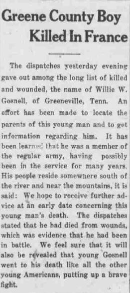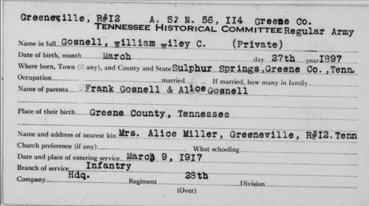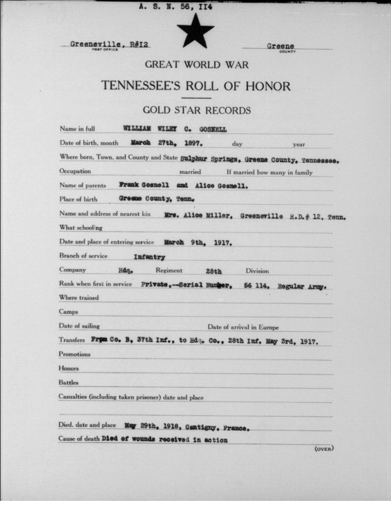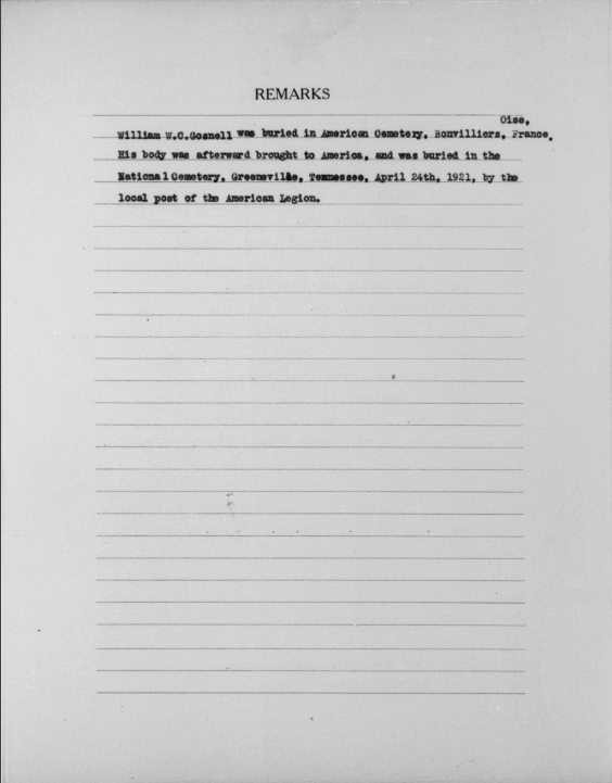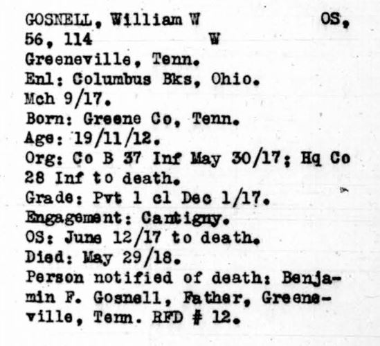 William Wiley C. Gosnell was born at Sulphur Spring, Greene County, Tennessee to Frank and Alice Gosnell. He entered the service on 9 March 1917. He died of wounds received in action at Cantigny, France was initially buried at the American Cemetery Bonviller, Oise in France. PFC Gosnell is buried at the Andrew Johnson National Cemetery, Greeneville, TN, A, 17.