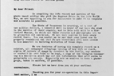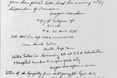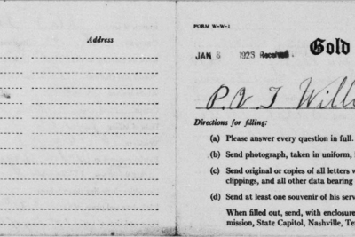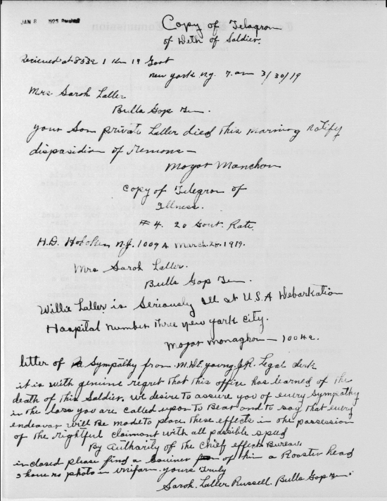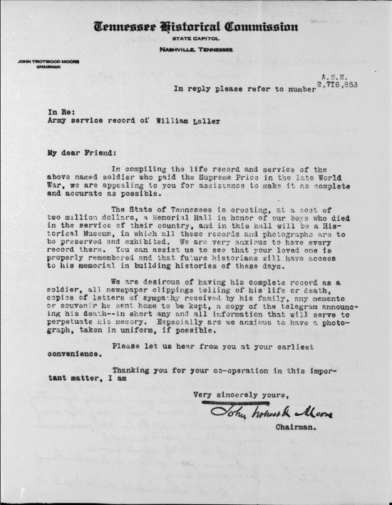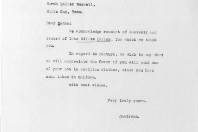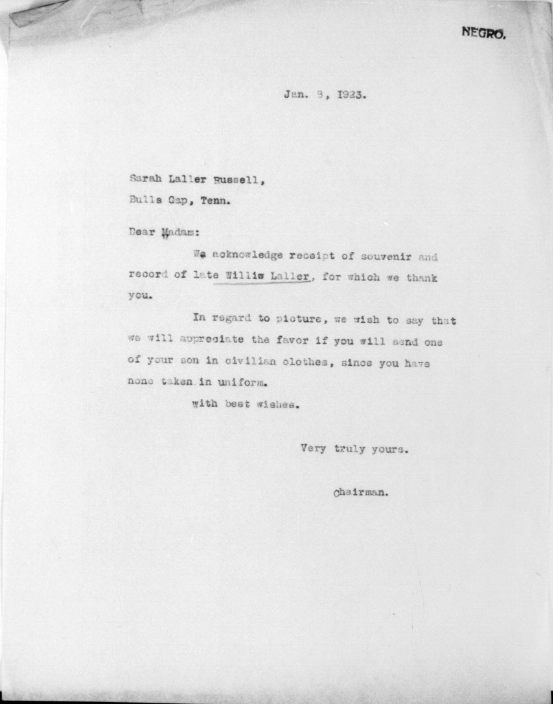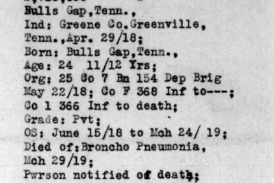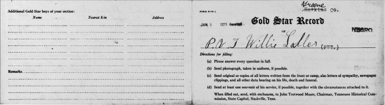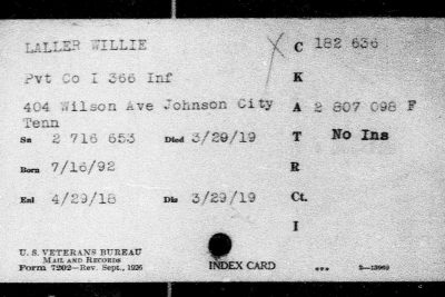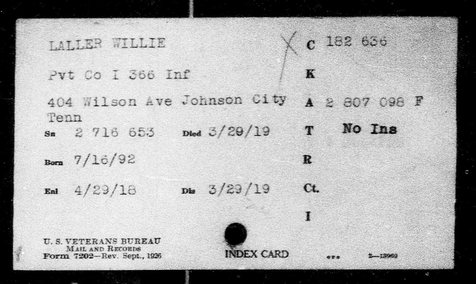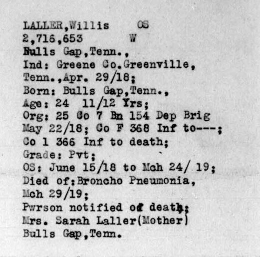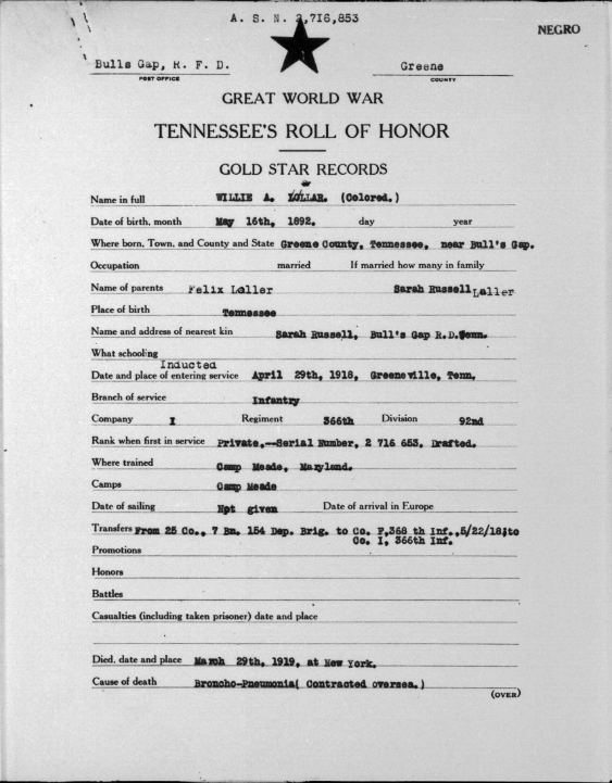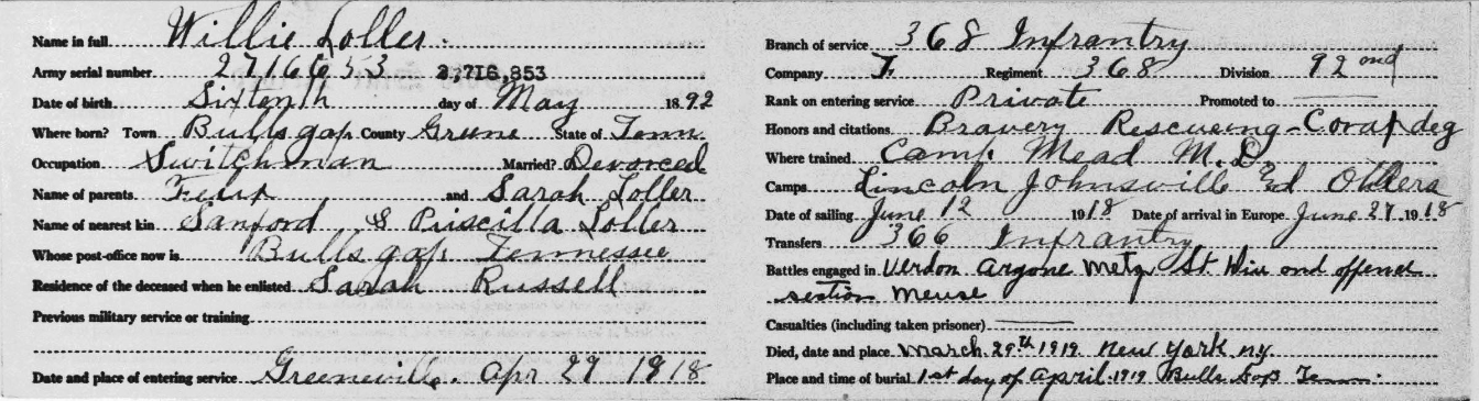 Willie L. Lollar (also spelled as Loller and Laller) was born near Bulls Gap, Greene County to Felix Loller and Sarah Russell. He was inducted 29 March 1918 at Greeneville, Tn and trained at Camp Meade in Maryland. He sailed to Europe on 12 June 1918, arriving June 27th. He participated in several battles in France and returned home. He died broncho-pneumonia at Hospital No. 3 in New York on March 29, 1919. He was buried in Bulls Gap on the first day of April 1919.
