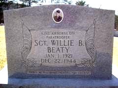 Sergeant Beaty enlisted in the military on July 16, 1942 in Fort Oglethorpe, Georgia. He served in the European theater of the war in Company G, 505th Parachute Infantry Regiment, 82nd Airborne Division. He was killed in action while fighting in the Battle of the Bulge in Belgium on December 22, 1944. He is buried or memorialized in Storie Cemetery in Little Crab, Fentress County, Tennessee.