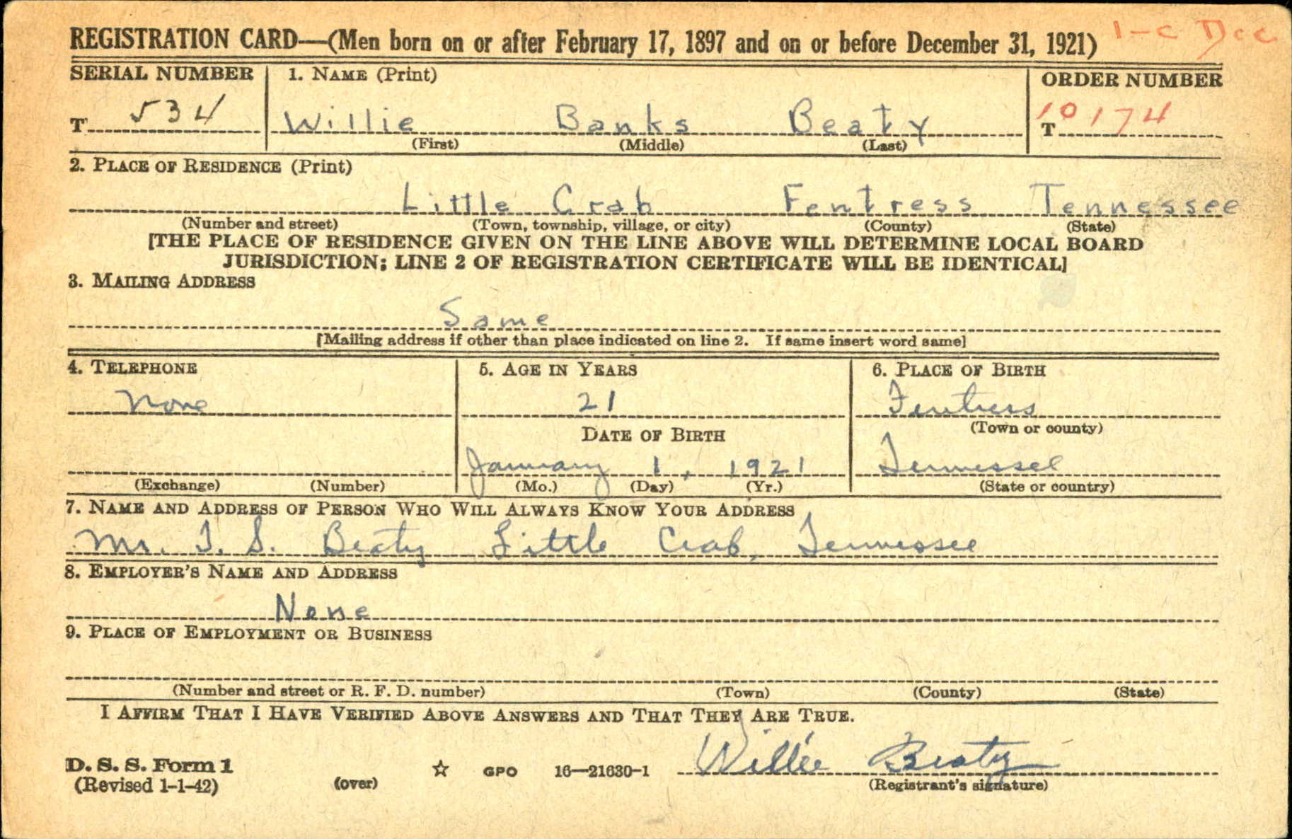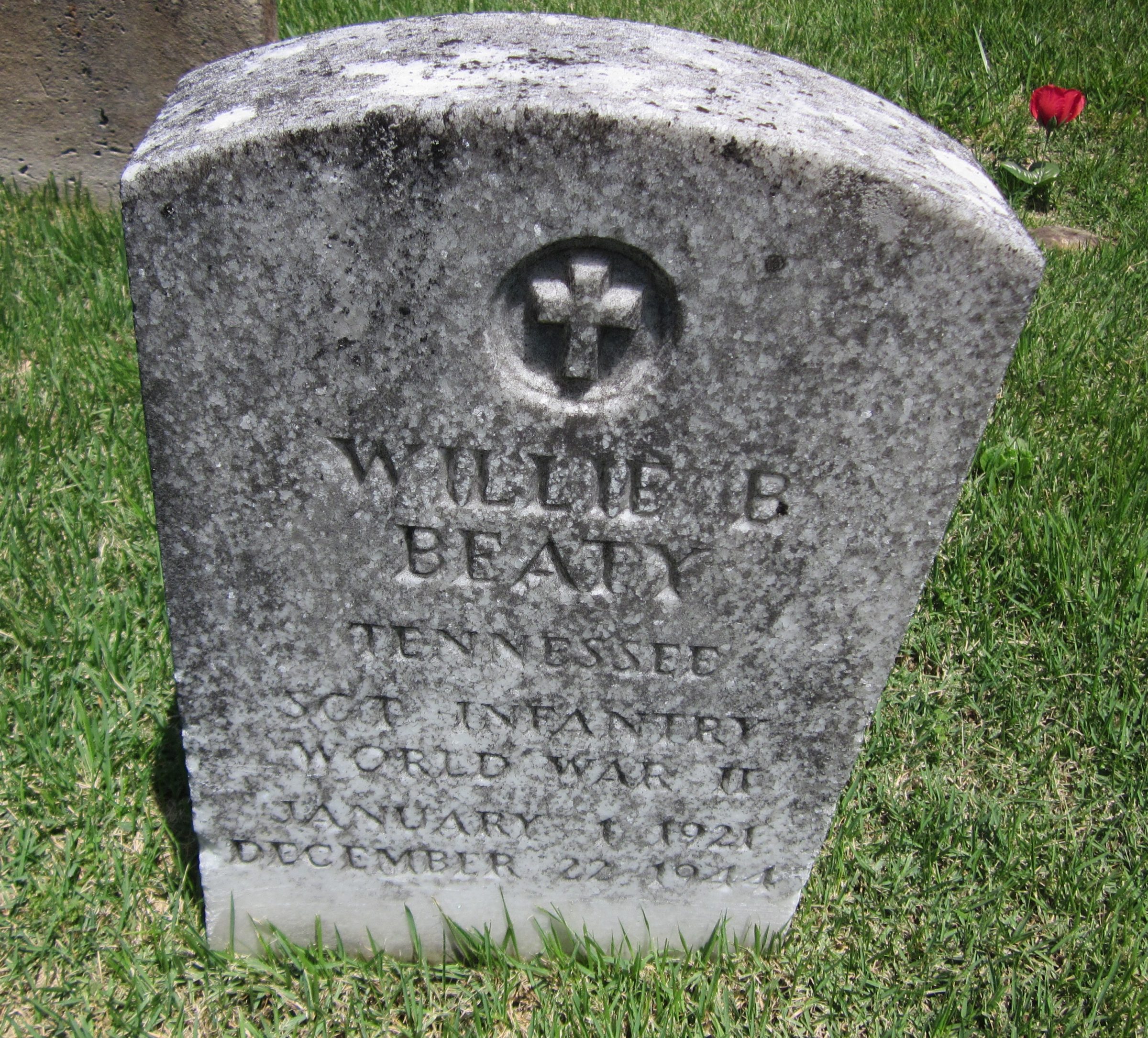 Sergeant Willie Banks Beaty was born on January 1, 1921. He was the son of Thomas Sylvester Beaty and Ida Parsetta Hinds Beaty. He was the brother of Pairlia Glee Beaty Hawk, James Ray Beaty, Ova Dean Beaty (who died in childhood), Noah Willis Beaty (who died in infancy), Vona Mae Beaty (who died in infancy), and Baby Beaty (who died in infancy).