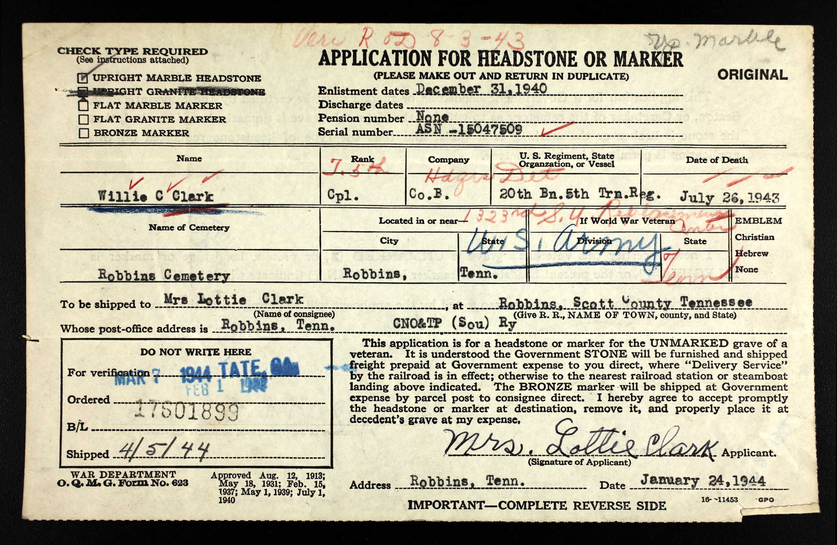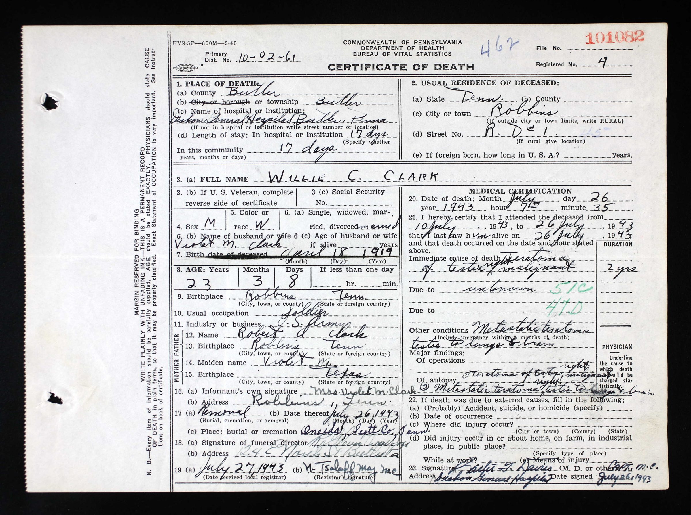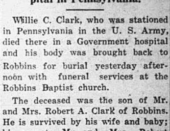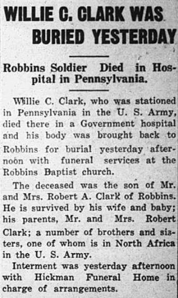 Willie C. Clark, who was stationed in Pennsylvania in the U.S. Army, died there in a Government hospital and his body was brought back to Robbins for burial yesterday afternoon with funeral services at the Robbins Baptist Church. The deceased was the son of Mr. and Mrs. Robert A. Clark of Robbins. He is survived by his wife and baby; his parents; a number of brothers and sisters, one of whom is in North Africa in the U.S. Army. Interment was yesterday afternoon with Hickman Funeral Home in charge or arrangements.