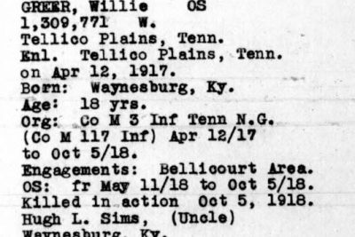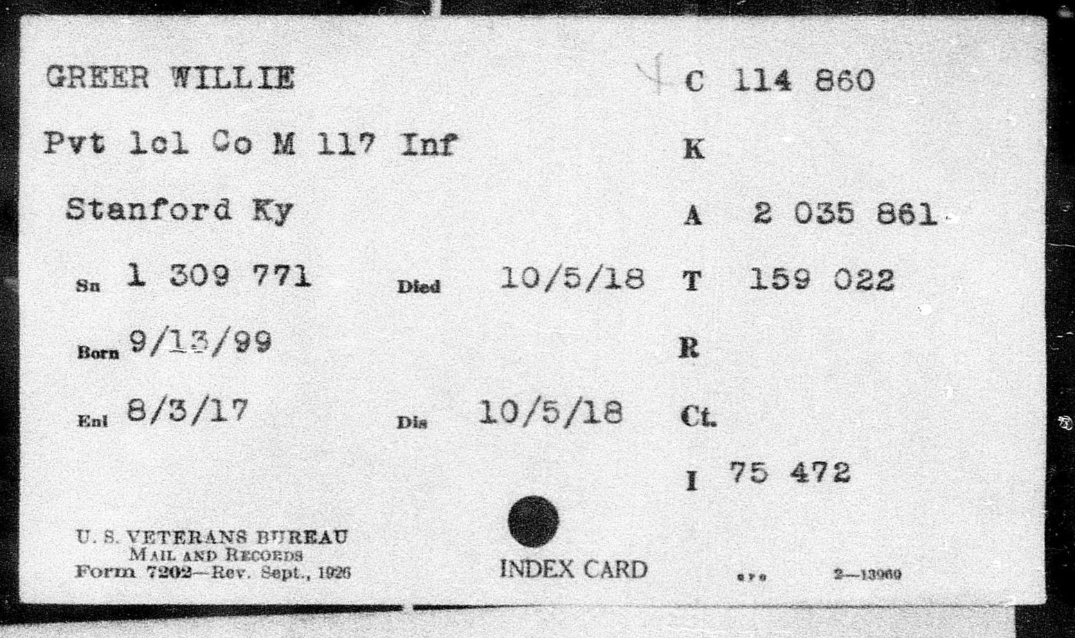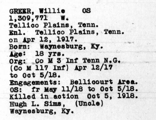 Willie Greer was born 11 October 1901, Waynesburg, Lincoln County in Kentucky. He was killed in action on 5 October 1918 in Bellicourt, France.